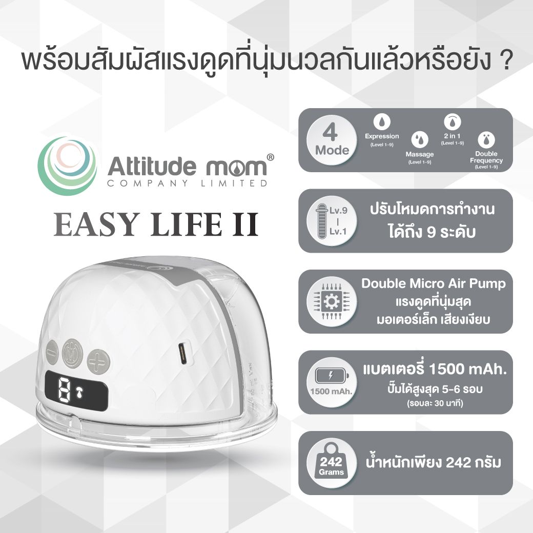 นางสาวสุรีย์ คุณมงคลวุฒิ กรรมการบริหาร Attitude Mom & Plentitudeกล่าวว่า Attitude Momดำเนินธุรกิจก้าวเข้าสู่ปีที่ 8 ซึ่งคุณแม่ให้การสนับสนุนเราด้วยดีเสมอมา เรายังคงตั้งใจรณรงค์ในเรื่องของน้ำนมแม่ให้ทุกคนได้รับรู้ถึงประโยชน์ และเลี้ยงลูกด้วยน้ำนมแม่ “เพราะน้ำนมแม่มีประโยชน์ต่อลูกน้อย ไม่ว่านมอะไรก็ทดแทนน้ำนมแม่ไม่ได้” พร้อมทั้งหานวัตกรรมใหม่ ๆ เพื่อนำมาพัฒนาสินค้าและบริการ ให้ตอบโจทย์คุณแม่ยุคใหม่มากที่สุด และในปีนี้Attitude Momมีผลิตภัณฑ์ใหม่ที่จะเป็นตัวช่วยให้แก่คุณแม่ นั่นก็คือ เครื่องปั๊มนมไร้สาย รุ่น Easy Life llที่เหมาะสำหรับคุณแม่ Working Mom ปั๊มน้ำนมได้อัตโนมัติเพียงใส่ไว้ในบราสะดวกสบายแม้ออกไปข้างนอก