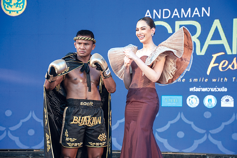 ปลุกนักท่องเที่ยวถนนคนเดินภูเก็ตให้คึกคักด้วยสินค้าหัตถกรรมไทย พบกับ “บัวขาว บัญชาเมฆ”ผ่านกางเกงมวยไทยผ้าไหมครั้งแรกของโลก ร่วมกับ “แอนนา เสือ” ในชุดแฟชั่นผ้าไทยสุดอลังการ