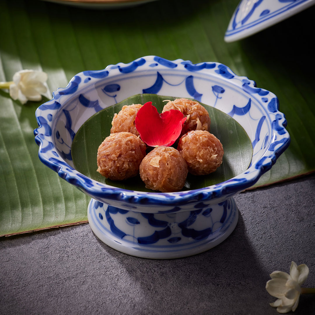 หอมแดงไส้ปลายี่สนผัดหวาน - ใช้หอมแดงโทนลูกใหญ่ คว้านเนื้อในออกและสอดไส้ ปลายี่สนผัดหวาน เข้าไปแทนที่ จากนั้นนำหอมแดงสอดไส้ลงชุบแป้งลงทอดจนกรอบเหลือง เคล็ดลับการปรุงไส้ปลายี่สนผัดหวาน นำปลายี่สนไปต้มจนสุกและนำมาลอกหนัง แกะก้างออก นำเฉพาะส่วนเนื้อปลาเผัดกับน้ำตาลโตนด และน้ำมันหอมเจียวจนได้รสหวานหอม หมูฝอยหรือเมื้อฝอย - นำหมูหรือเนื้อแดดเดียวมานึ่งแล้วฉีกเป็นเส้น จากนั้นทอดแล้วผัดเคลือบน้ำตาล โรยด้วยหอมเจียวเพื่อเพิ่มกลิ่นหอม