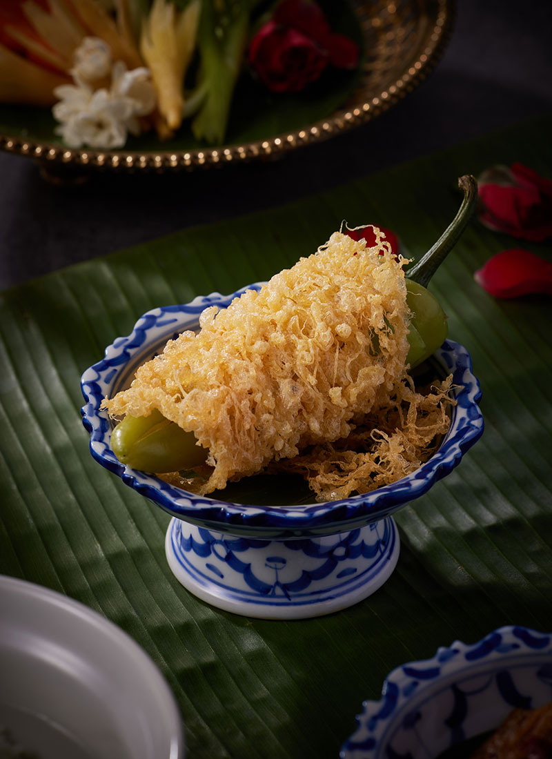 พริกหยวกสอดไส้ - ใช้พริกหยวกเม็ดใหญ่ กรีดตรงกลางเพื่อนำเมล็ดออก สอดไส้ด้วยเนื้อหมูบดผสมเนื้อกุ้งสับ ที่ปรุงรสด้วยรากผักชี กระเทียม และพริกไทย แล้วนำทอดและห่อด้วยแพไข่ทอดสีเหลืองสวย หัวไชโป๊วผัดหวาน - ที่ทางเชฟเลือกใช้หัวไชโป๊วชั้นดีจากจังหวัดราชบุรีมาผัดกับน้ำตาลโตนดและน้ำมันหอมเจียวจนแห้งเข้าเนื้อ เป็นเส้นใสมันวาว หวานกลมกล่อม และผักแนมที่มีทั้งกระชายสด มะม่วงดิบ และผักสดอื่นๆ เป็นตัวช่วยชูให้รสเครื่องเคียงโดดเด่นอีกด้วย