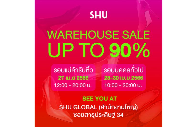 หนึ่งปีมีครั้ง มหกรรมสินค้าลดครั้งยิ่งใหญ่ SHU WAREHOUSE SALE UP TO 90% หลังจากห่างหายกันไป 2 ปี กลับมาครั้งนี้ เรียกว่าจัดเต็มทุกไอเทม ลดกระหน่ำแบบลืมร้อน ทั้งรองเท้า กระเป๋า เสื้อผ้า ขนกันมาลดสูงสุด 90% บอกเลยว่าราคาพิเศษสุดๆ เริ่มต้นด้วยราคาหลักร้อย พร้อมโปรโมชั่นอีกเพียบ ตั้งแต่วันที่ 27-30 เมษายน 2566 เวลา 10.00 - 20.00 น. ณ SHU GLOBAL สำนักงานใหญ่ ซอยสาธุประดิษฐ์ 34 โดยจะแบ่งรอบการช้อปปิ้งออกเป็น 2 รอบ ได้แก่
