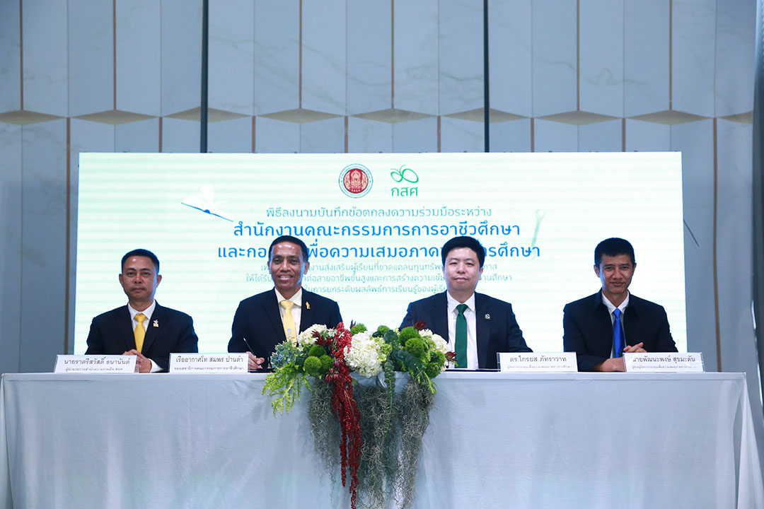 22 พฤษภาคม 2566 เรืออากาศโท สมพร ปานดำ รองเลขาธิการคณะกรรมการการอาชีวศึกษา พร้อมด้วย ดร.ไกรยส ภัทราวาท ผู้จัดการกองทุนเพื่อความเสมอภาคทางการศึกษา ลงนามบันทึกข้อตกลงความร่วมมือ “เพื่อการดำเนินงานส่งเสริมผู้เรียนที่ขาดแคลนทุนทรัพย์หรือด้อยโอกาสให้ได้รับการศึกษาต่อสายอาชีพชั้นสูง และสร้างความเข้มแข็งสถานศึกษาในการยกระดับผลลัพธ์การเรียนรู้ของผู้เรียน” ณ โรงแรม เดอะ ควอเตอร์ อารีย์ กรุงเทพฯ