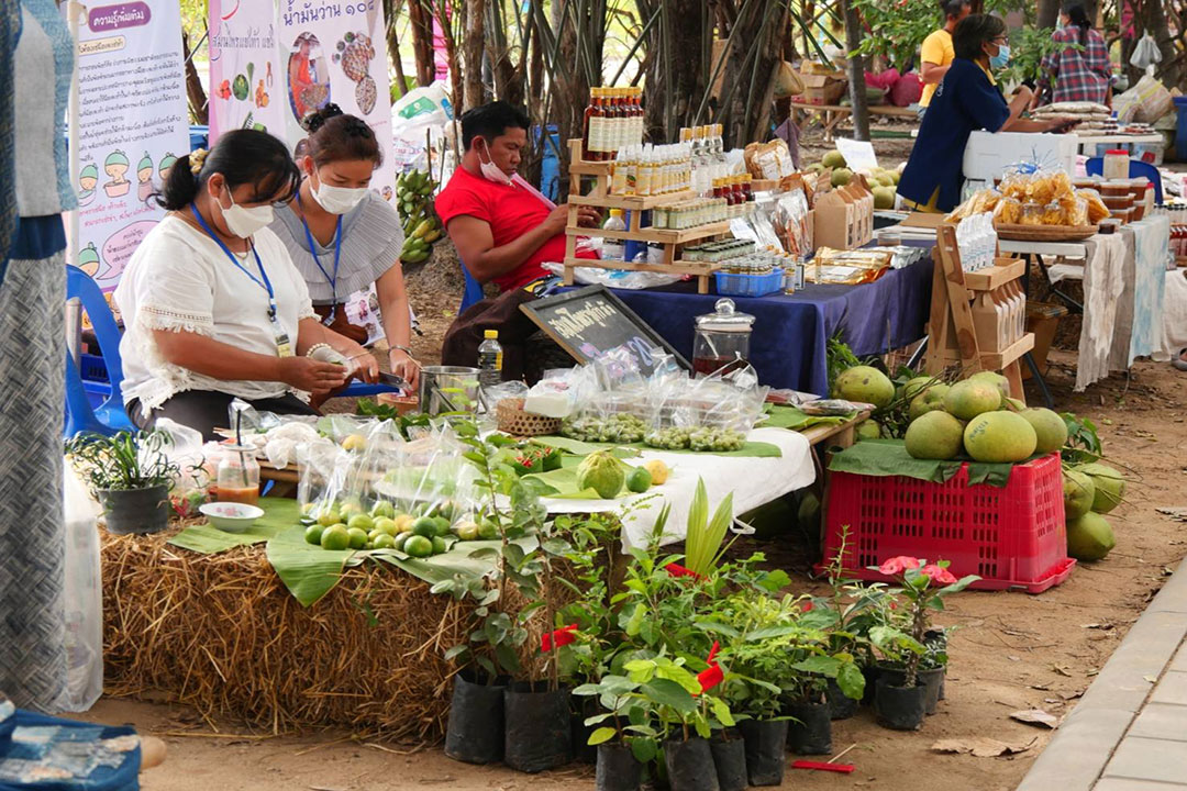 ชม ช้อป สินค้าเกษตรปลอดภัย ผัก ผลไม้ สดใหม่จากสวน ผลิตภัณฑ์แปรรูปคุณภาพ จากเครือข่ายเกษตรกรและภาคีความร่วมมือ ที่นำมาจำหน่ายให้ผู้เข้าร่วมงานได้เลือกซื้อกลับบ้านในราคาย่อมเยา