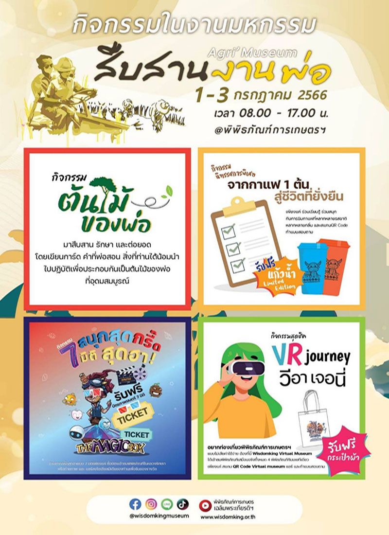 สอบถามรายละเอียดเพิ่มเติมได้ที่ โทรศัพท์ 02-529-2212-13, 087-359-7171 คลิกดูรายละเอียดได้ที่ www.wisdomking.or.th หรือ facebook / Instagram /Line ID : @wisdomkingmuseum และ Youtube พิพิธภัณฑ์การเกษตรเฉลิมพระเกียรติฯ