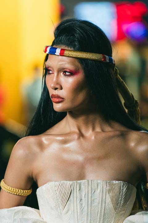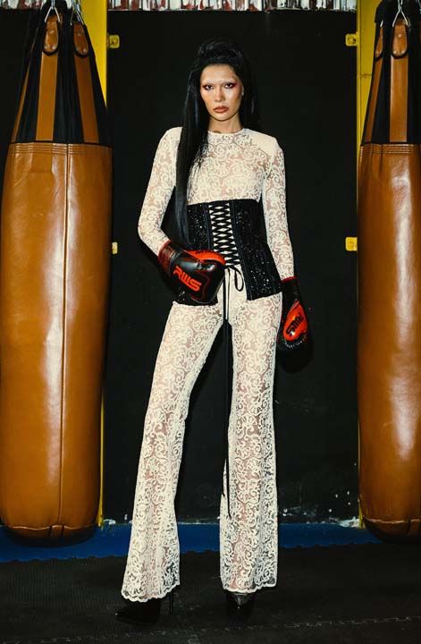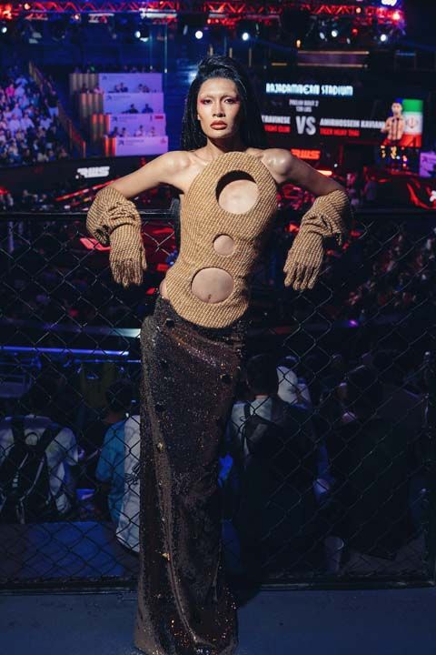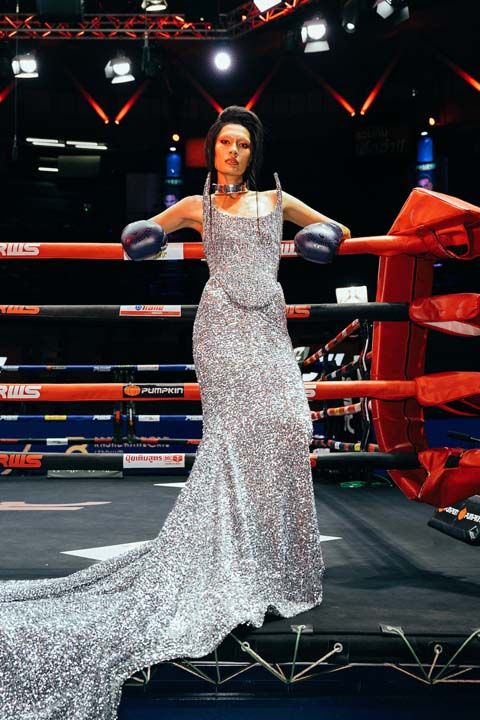 ด้านนางแบบของแฟชั่นเซตนี้ เจมม่า-พิรดา เสาวรส นักศึกษาและนางแบบ LGBTQ+ รุ่นใหม่แห่งวงการแฟชั่น ผู้เคยผ่านการฝึกมวยไทยมาแล้วในชีวิตจริง ยอมรับว่า เธอดีใจและภูมิใจมากที่ได้ถ่ายแฟชั่นเซตนี้ให้กับ FLYNOW เป็นการทำงานที่ขนลุกหลายครั้งมาก เพราะได้สวมชุดโอต์กูตูร์ของแบรนด์ที่เราชอบมาตั้งแต่เด็ก แล้วยังได้ถ่ายแฟชั่นบนเวทีมวยระดับตำนานของไทยและของโลกด้วย โดยเฉพาะตอนที่ถ่ายแฟชั่นกับนักมวยมืออาชีพท่ามกลางแสง สี และเสียงเชียร์ของผู้คนรอบสนาม เป็นแมทช์ที่ชกกันจริง ๆ แล้วเราสวมชุดสีเงินถือธงชาติไทยอยู่ข้างสนามมันเป็น โมเมนท์ที่ตื่นเต้นและตื้นตันใจมาก