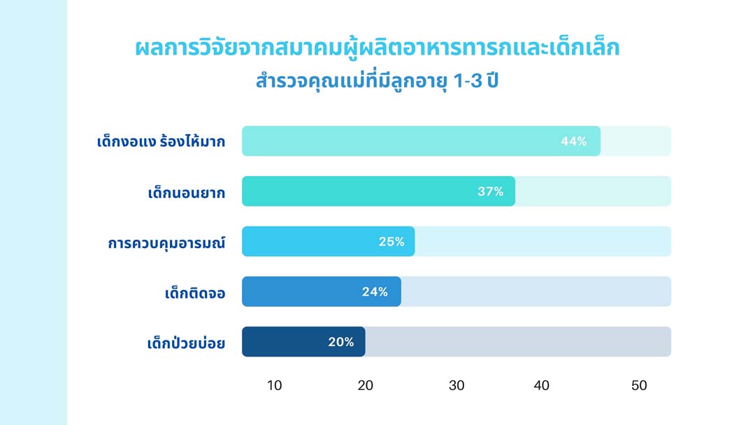 จากผลการวิจัยของทางสมาคมผู้ผลิตอาหารทารกและเด็กเล็ก ที่สำรวจคุณแม่ที่มีลูก อายุ 1-3 ขวบ พบว่าปัญหาที่คุณแม่มีความกังวลใจเกี่ยวกับการเลี้ยงลูกนอกจากเรื่องโภชนาการแล้ว ปัญหาอื่นๆ ที่คุณแม่มีความกังวลใจ 5 อันดับแรกได้แก่ ปัญหาเด็กป่วยบ่อย ร้อยละ 20 ปัญหาเด็กติดจอร้อยละ 24 ปัญหาการควบคุมอารมณ์ร้อยละ 25 ปัญหาเด็กนอนยากร้อยละ 37 และ ปัญหาเด็กงอแง ร้องไห้มากร้อยละ 44 ซึ่งปัญหาที่คุณแม่มีความกังวลใจเหล่านี้ อาจมีส่วนเกี่ยวพันกับปัญหาเด็กติดจอ โดยเฉพาะปัญหาการควบคุมอารมณ์ เด็กป่วยบ่อย และปัญหาเด็กนอนยาก ที่พบปัญหาในอัตราใกล้เคียงกัน