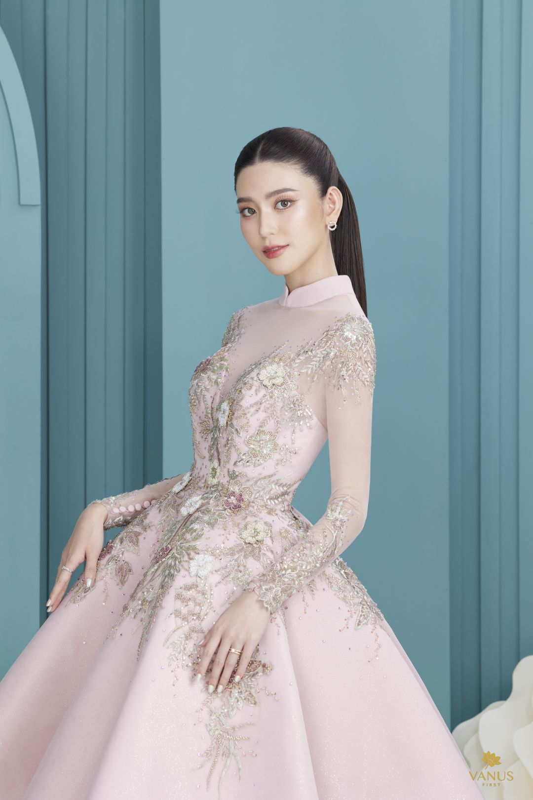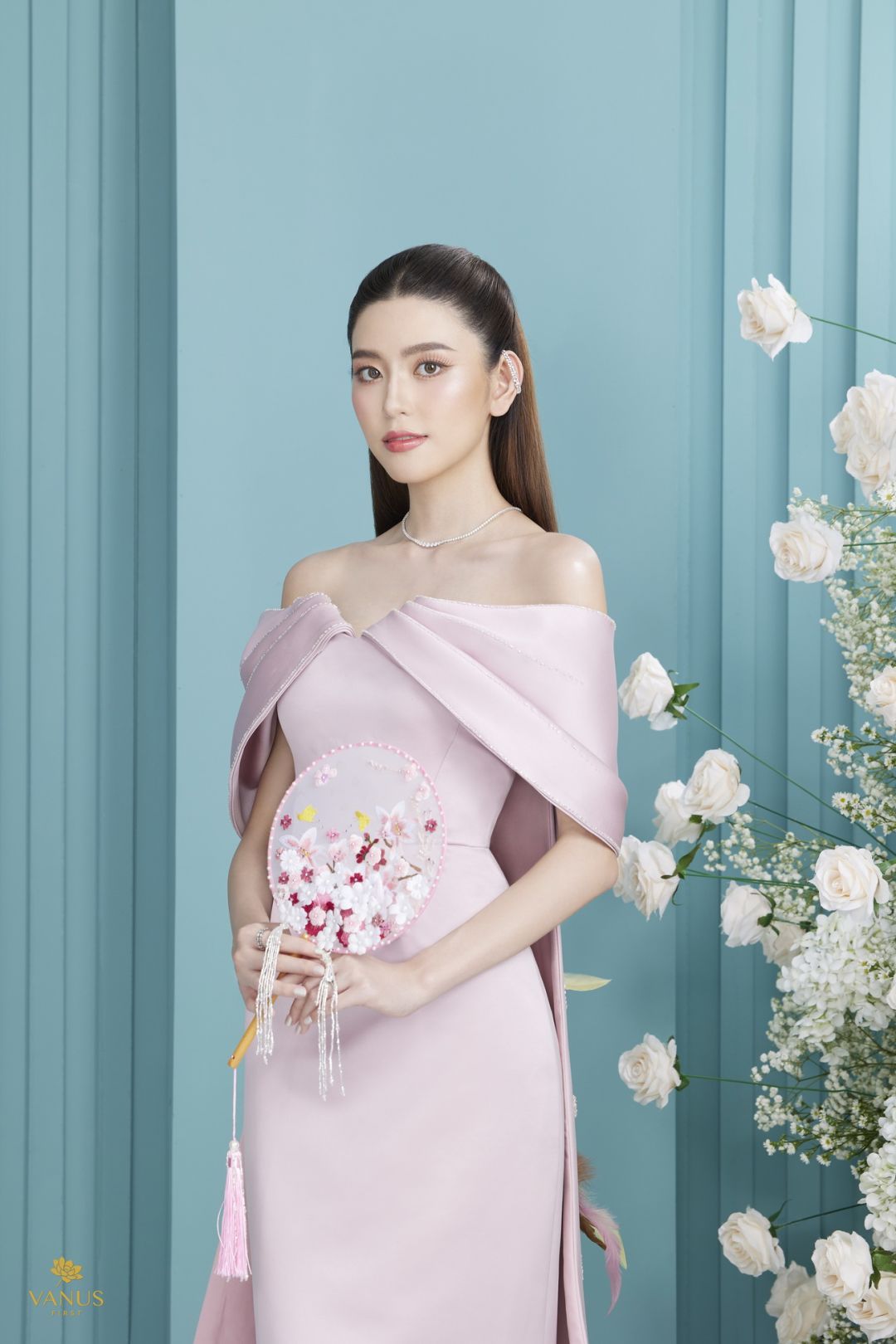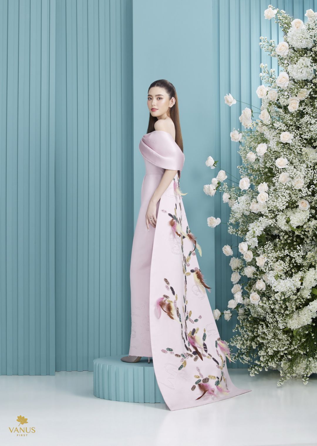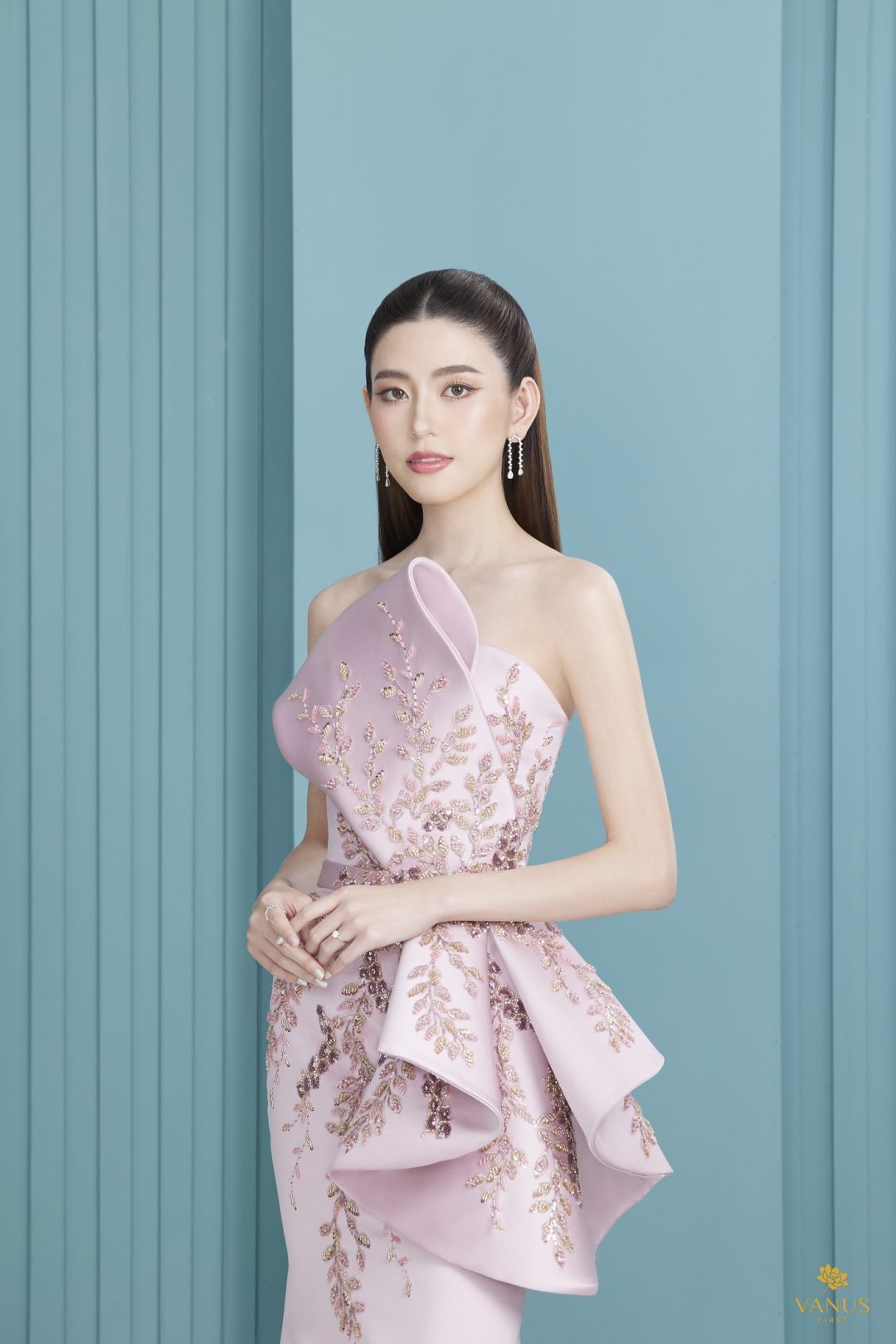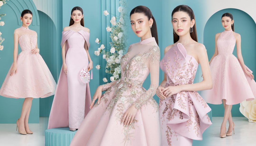 และอีก 5 ชุดยกน้ำชาสีชมพูกลีบบัวที่สวยละมุนนีเหมาะกับเจ้าสาวที่ชอบลุคที่ดูสดใสน่ารักไม่ซ้ำใคร ซึ่งแต่ละชุดนั้นถูกออกแบบมาให้สวยงดงามแต่งต่างเหนือใคร เริ่มที่ชุดเดรสสีชมพูกลีบบัวโอบไหล่สยายปีกชุดแรกนี้กันเลย ตัวกระโปรงถูกออกแบบให้ยาวถึงพื้นทรงสอบดินสอเป็นสไตล์เวสเทิร์น ด้านหลังมีผ้าจับทำเป็นเดรฟเกาะตรงส่วนขอบของเกาะอกชิ้นหลัง ตัวชุดประดับตกแต่งด้วยมณีนพเก้ารวมถึงขนของหงส์ที่นำมาย้อมแบบไล่ระดับเฉดสี บรรจงปักที่ตัวผ้างดงามอ่อนหวาน สง่างามเหนือคำบรรยาย