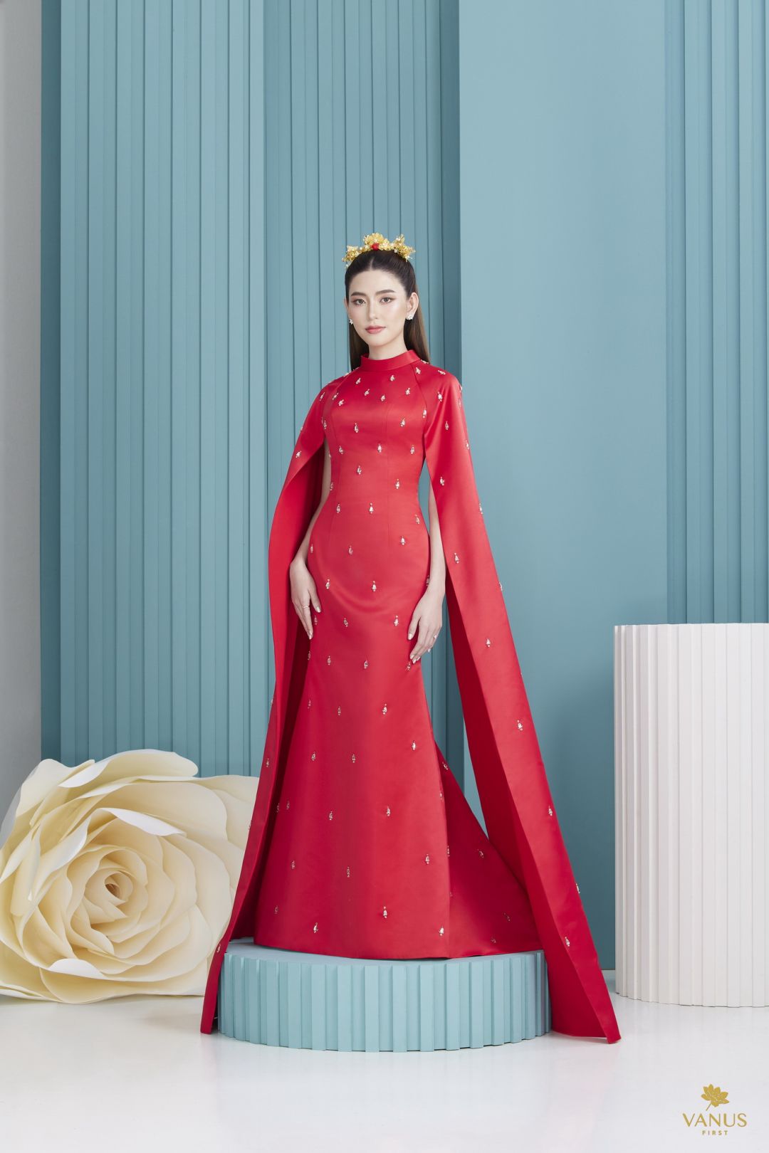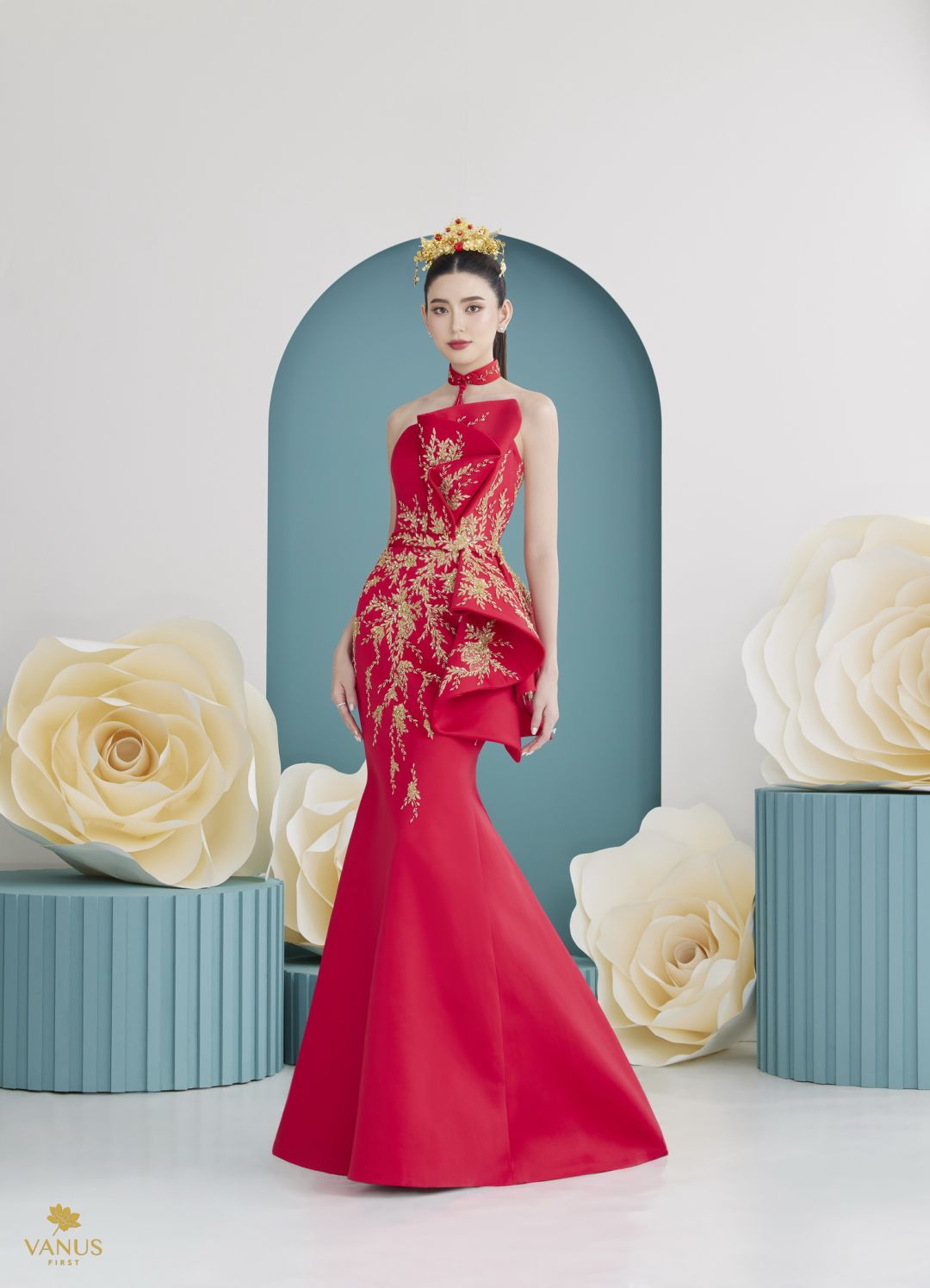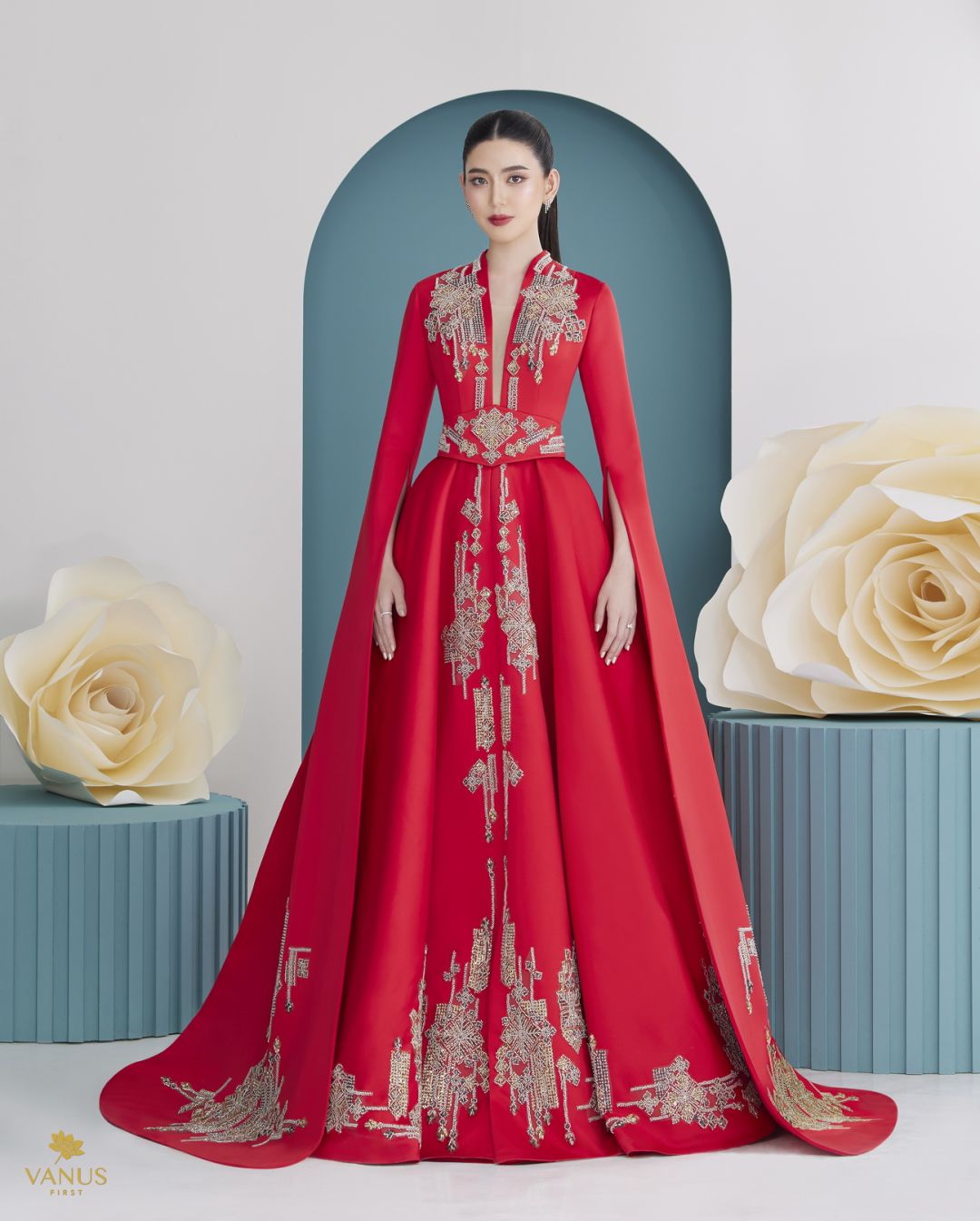 ชุดที่ 2 เป็นชุดทรงทรัมเป็ตสีแดงชาดสัญลักษณ์แห่งความมั่งคั่งของชาวจีน นำมาดีไซน์ตัดเย็บให้ออกมาให้เป็นทรงเอไลน์ ตัวเสื้อออกแบบให้เป็นทรงปีนลำคอดูงามระหง ช่วงแขนออกแบบให้มีความระย้าผ่าข้าง ลำแขนกรุยกรายงดงาม ประดับตกแต่งด้วยคริสตัลนานาชนิดสีใสดุจเพชรออกแบบด้วยลวดลายกราฟฟิกจุดไข่ปลาคาเวียร์สุดหรูหรางดงามหรูหราเกินคำบรรยาย