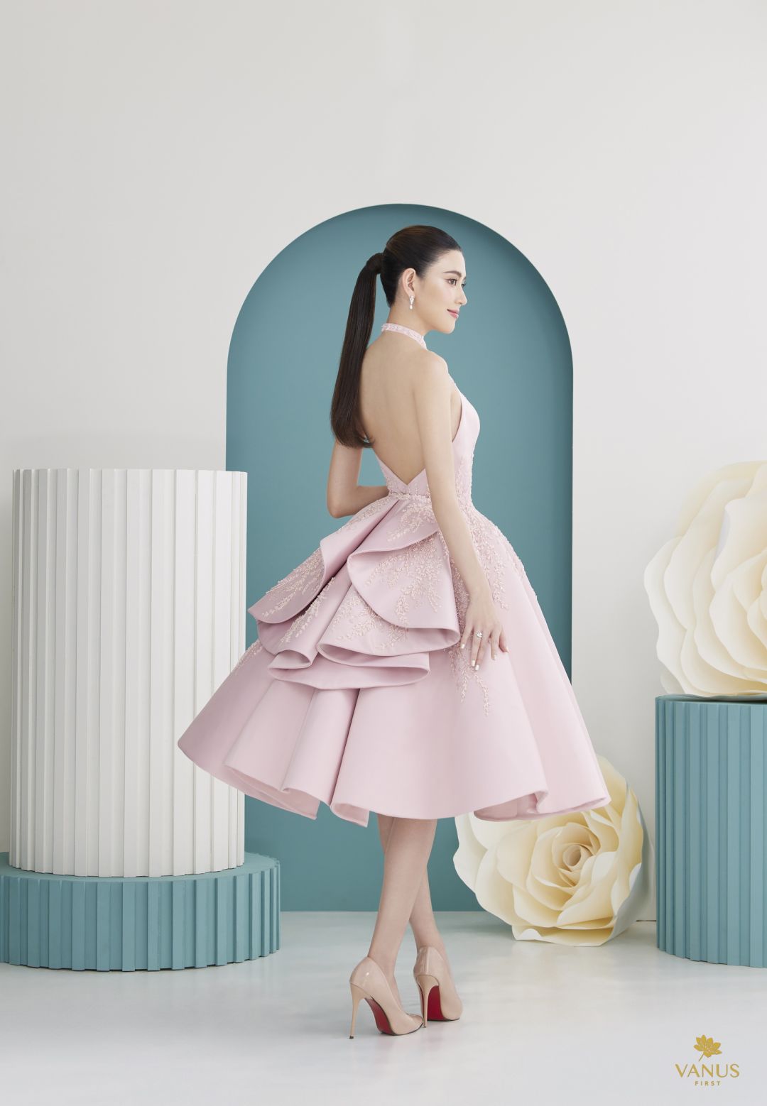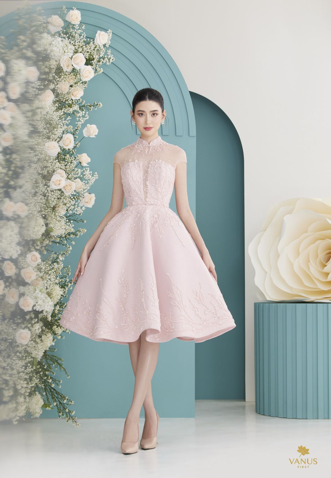 ปิดท้ายด้วยชุดยกน้ำชาในลุคเดรสสั้นคอจีนสวยหวานละมุนละไม ชุดนี้เป็นชุดเดรสสั้นทรงเอไลน์พองอยู่ตัวคงรูปด้วยแพทเทิร์นและเทคนิคในการตัดเย็บเฉพาะแบรนด์ห้องเสื้อ ตัวเสื้อเป็นผ้าไหมดัสเชสซาตินสีชมพูอ่อนเนื้อละเอียดมันวาวเล็กน้อยผ่ากลางเผยความเซ็กซี่เล็กน้อย คอเสื้อเป็นแบบคล้องคอทรงกี่เพ้าแบบจีนดั้งเดิมผสมผสานความเป็นจีนร่วมสมัย เป็นชุดแขนล้ำแบบโปร่ง ตัดเย็บด้วยแพทเทิร์นแบบฝรั่งเศส มีการใส่โครงอ่อนในชุดช่วยให้บีบรัดทรวดทรงให้ผู้ที่สวมใส่ชุดนี้มี อก เอว และสะโพกที่งดงาม เป็นอีกหนึ่งลุคที่เหมาะกับสาวหวานที่ต้องการความสวยโดดเด่นไม่ซ้ำใคร