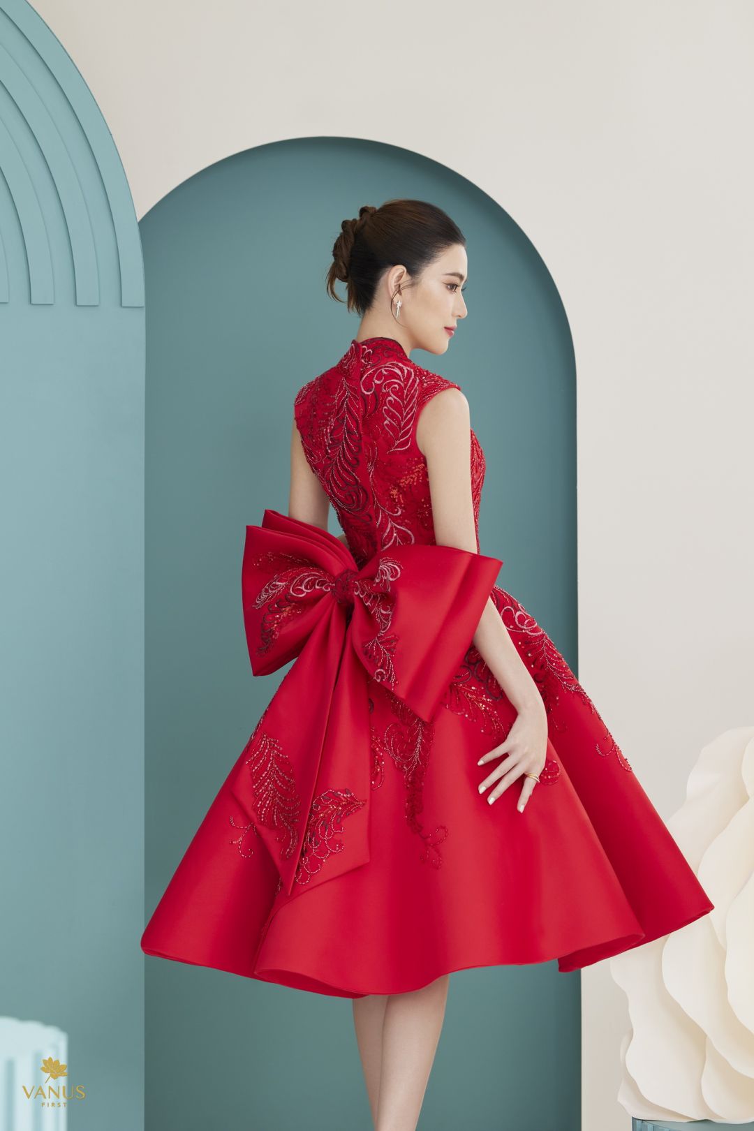 ชุดยกน้ำชาสีแดงชุดสุดท้าย เป็นชุดเดรสสั้นแขนกุดทรงเอไลน์พองคงรูป ดีไซน์ช่วงอกให้เว้าลึกเสริมลุคให้ ดูเซ็กซี่อย่างมีสไตล์ เพิ่มความหรูหราของลวดลายบนชุดด้วยคริสตัลสวารอฟสกี้ เติมความสดใสน่ารักด้วยการ เพิ่มดีเทลด้วยโบด้านหลัง เป็นอีกหนึ่งที่สวยงดงามจับตาเหมาะกับเจ้าสาวยุคใหม่แห่ง พ.ศ. นี้จริงๆ
