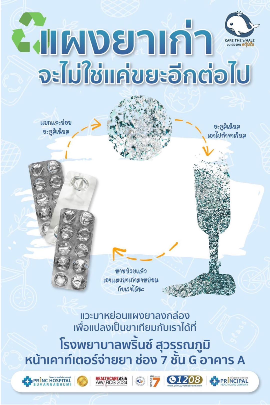 อติยา อาวัชนาการ ประธานเจ้าหน้าที่ด้านความยั่งยืน และเลขานุการบมจ.พริ้นซิเพิล แคปิตอล (PRINC) กล่าวเสริมว่า โครงการรับบริจาคแผงยาเก่า ซึ่งเป็นขยะประเภท Multilayer plastic; MLP (ขยะที่ไม่มีที่ไป รีไซเคิลแล้วไม่ได้ราคา) โดยมีโรงพยาบาลพริ้นซ์ สุวรรณภูมิ และโรงพยาบาลในเครือเปิดจุดรับขยะ (Drop point) ซึ่งแผงยาเก่าที่ได้รับบริจาคมานี้จะมีการคัดแยกยาเก่าและนำไปทิ้งอย่างถูกวิธี ส่วนแผงอะลูมิเนียมส่งต่อวัดจากแดง ซึ่งใช้เครื่องคัดแยก Advance Pyrolysis ที่เป็นเทคโนโลยีที่สามารถแยกและย่อยขยะประเภทถุงวิบวับและแผงยาอย่างมีประสิทธิภาพ โดยแยกชั้นพลาสติกได้เป็นน้ำมันเชื้อเพลิงวนกลับมาใช้กับเครื่อง Pyrolysis และอะลูมิเนียมที่สามารถนำไปใช้งานต่อในอีกหลายรูปแบบ โดยโรงพยาบาลวางแผนส่งต่ออะลูมิเนียมที่แยกจากแผงยาเก่าแปลงเป็นทุนมอบให้กับมูลนิธิขาเทียมฯเพื่อช่วยเหลือผู้อื่นต่อไป เสมือนการนำแผงยาเก่าที่ใช้ในการรักษาผู้เจ็บป่วย แล้วแผงยานั้นก็ได้ถูกแยกและนำกลับมาใช้ประโยชน์ใหม่ และยังส่งต่อให้กับผู้พิการได้อีกด้วย