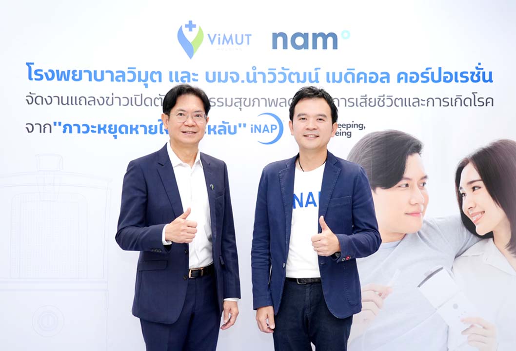 โรงพยาบาลวิมุต ผนึกความร่วมมือกับ บริษัท นำวิวัฒน์ เมดิคอล คอร์ปอเรชั่น จำกัด (มหาชน) หรือ NAM ผู้นำด้านการผลิต นำเข้าและจัดจำหน่ายเครื่องมือและอุปกรณ์ทางการแพทย์ชั้นนำของไทย ยกระดับคุณภาพการนอนหลับด้วยการเปิดตัวเทคโนโลยี iNAP (Intraoral Negative Airway Pressure Therapy) ช่วยรักษาอาการนอนกรนที่คุกคามคนไทยกว่า 25% ซึ่งเป็นสัญญาณเสี่ยงของภาวะหยุดหายใจขณะหลับ (Obstructive Sleep Apnea : OSA) ภัยเงียบคุกคามสุขภาพคนไทยกว่า 3 ล้านคน อาจส่งผลให้เกิดโรคร้ายแรงทั้งทางกายและจิตใจ เช่น อารมณ์แปรปรวนง่าย อ่อนเพลีย ง่วงนอนมากระหว่างวันจนเป็นอันตรายต่อชีวิต ความเสี่ยงในการเกิดโรคหัวใจ ความดันโลหิตสูงและโรคแทรกซ้อนอื่นๆ ในระยะยาว พร้อมชวนคนไทยสังเกตตนเองและคนรอบตัว หากมีอาการนอนกรนอยู่เป็นประจำ ควรรีบพบแพทย์เพื่อทำการวินิจฉัยและรักษาต่อไป ทั้งนี้ เพื่อโอกาสในการกลับมาใช้ชีวิตได้อย่างมีคุณภาพและลดอัตราการเสียชีวิตที่ป้องกันได้