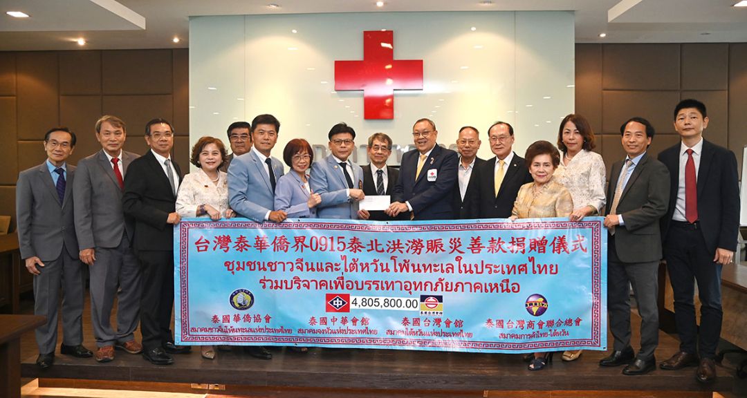 มิสเตอร์จาง จวิ้นฝู ผู้อำนวยการใหญ่ สำนักงานเศรษฐกิจและวัฒนธรรมไทเป ประจำประเทศไทย เยือนสภากาชาดไทย เพื่อเป็นสักขีพยานในการที่ชุมชนชาวจีนและไต้หวันโพ้นทะเลในประเทศไทยมอบเงินบริจาคให้สภากาชาดไทย รวม 4,805,800 บาท (สี่ล้านแปดแสนห้าพันแปดร้อยบาทถ้วน) ให้กับ ขรรค์ ประจวบเหมาะ ผู้อำนวยการสำนักงานจัดหารายได้ สภากากาดไทย เพื่อนำไปจัดถุงยังชีพ ช่วยเหลือพี่น้องชาวไทยที่กำลังประสบอุทกภัยพื้นที่ของภาคเหนือ ในจังหวัดเชียงราย น่าน พะเยา และเชียงใหม่ โดยมี พิพัฒน์หวังพิชิต ที่ปรึกษาประธานาธิบดีไต้หวัน, พรชัย อยู่วิมลชัย ประธานสมาคมชาวจีนโพ้นทะเลแห่งประเทศไทย, บรินดา จางขจรศักดิ์ นายกสมาคมไต้หวันแห่งประเทศไทย, เฉิน ฮั่นชวน นายกสมาคมการค้าไทย-ไต้หวัน, ณรงค์ ดีโรจนวงศ์ นายกสมาคมจงหัวแห่งประเทศไทย,ธัญวลัย เดชเจริญจิรดา นายกกิตติมศักดิ์ สมาคมการค้าไทย-ไต้หวัน, พรทิพย์ชูพินิจศักดิ์ นายกกิตติมศักดิ์ สมาคมไต้หวันแห่งประเทศไทย ร่วมกันเป็นสักขีพยาน ณ สำนักงานจัดหารายได้ สภากาชาดไทย เมื่อวันที่ 24 กันยายน ที่ผ่านมา