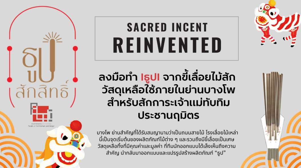 ธูป สัก สิทธิ์ โดย ARCHD KMUTNB โปรเจ็กต์ทำ “ธูป” จากขี้เลื่อยไม้สัก วัสดุเหลือใช้ในย่านบางโพสำหรับสักการะเจ้าแม่ทับทิม โรงเลื่อยไม้เหล่านี้เป็นจุดเริ่มต้นของผลิตภัณฑ์ไม้ต่างๆ รวมถึงมีขี้เลื่อยซึ่งเป็นเศษวัสดุเหลือทิ้งที่มีคุณค่าและมูลค่า ทีมนักออกแบบตระหนักถึงความสำคัญและประโยชน์ใช้สอยของขี้เลื่อย จึงนำกลับมาออกแบบและแปรรูปจนเกิดเป็นผลิตภัณฑ์ใหม่อย่าง“ธูป สัก สิทธิ์” ที่ไม่เหมือนใคร เฉพาะวันเสาร์และวันอาทิตย์ 15 - 16, 22 - 23 กุมภาพันธ์ 2568 ตั้งแต่เวลา 12.00 -20.00 น. สถานที่: BangPho Green Space