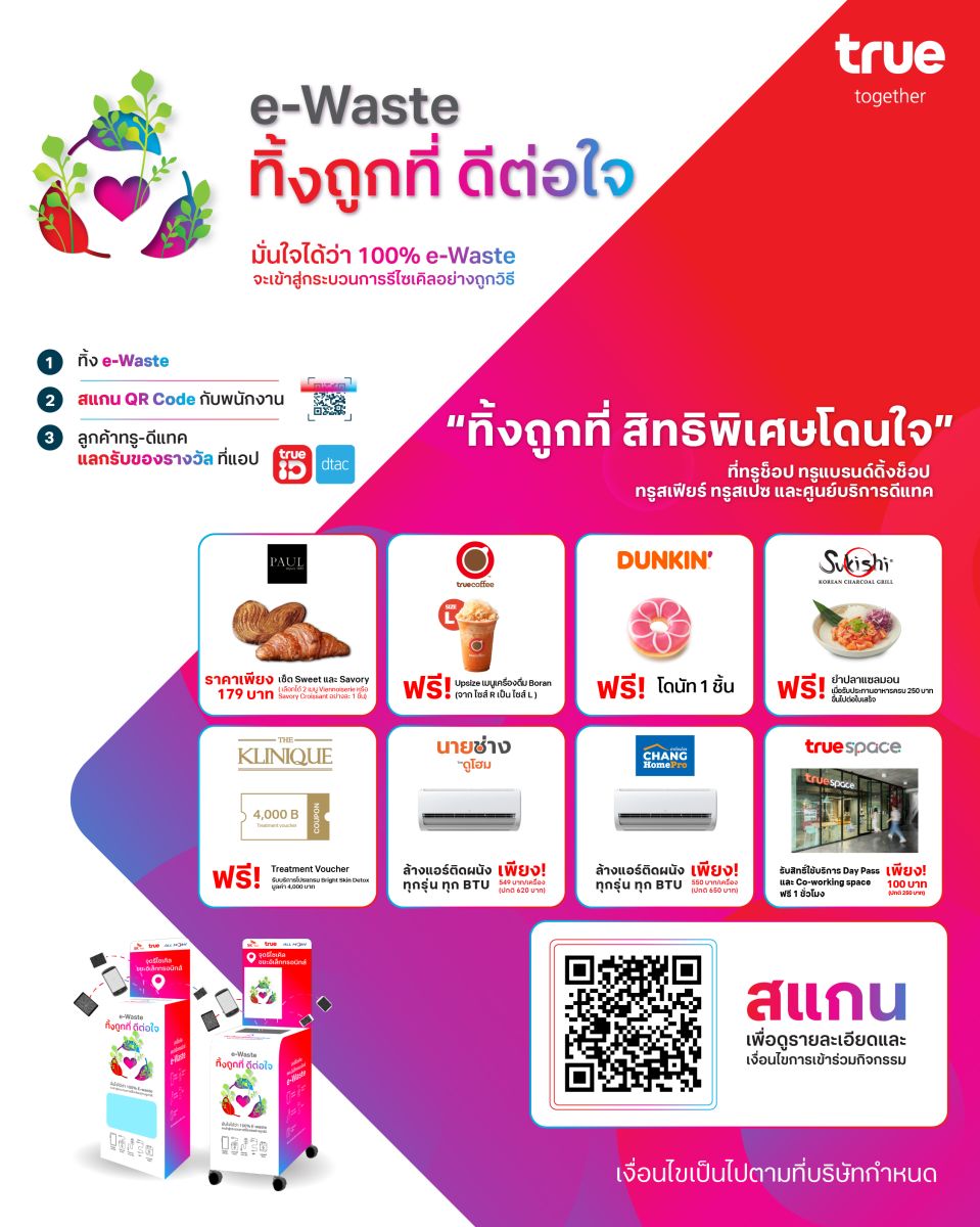 ทิ้ง 1 เลือกรับสิทธิพิเศษจาก 8 แบรนด์ดัง ยิ่งไปกว่านั้น อีกหนึ่งความพิเศษของโครงการฯ ที่ยังคงมอบให้แก่ลูกค้าคนสำคัญ เพียงนำขยะอิเล็กทรอนิกส์ มาทิ้งที่กล่อง e-Waste ณ ทรูช็อป ทรูแบรนด์ดิ้งช็อปทรูสเฟียร์ ทรูสเปซ และศูนย์บริ การดีแทค 155 สาขาทั่วประเทศ พร้อมสแกน QR Code เพื่อแลกรับของรางวัล “Drop for Reward” จาก 8 แบรนด์ชั้นนำที่แอปพลิเคชันทรูไอดี และ dtac app ตั้งแต่วันนี้–31 ธันวาคม 2568 ได้แก่ Paul ,True Coffee ,Dunkin Donut ,Sukishi Korean Charcoal Grill ,THE KLINIQUE ,นายช่าง ดูโฮม ,Home Service by Home Pro และ ทรูสเปซ