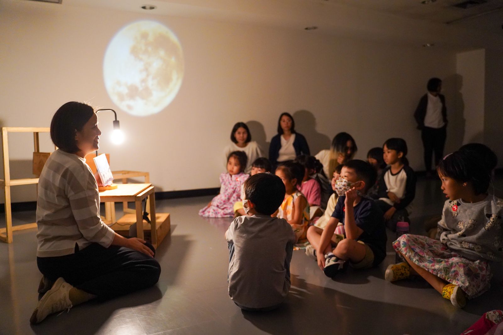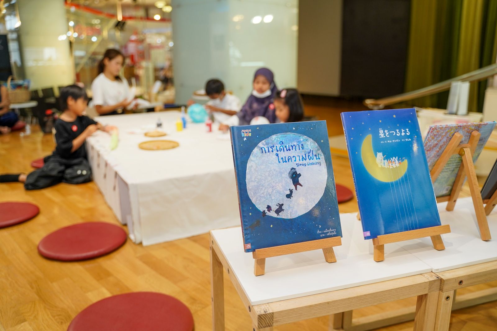 มุมอ่านอิสระ & พื้นที่เล่นสร้างสรรค์ จัดไว้ให้เด็ก ๆ ได้เลือกหนังสือภาพในธีมพระจันทร์ และสร้างงานศิลปะอย่างอิสระ เช่น การ “ย้อมสีคุณพระจันทร์” ที่เด็กสามารถทดลองใช้สีและวัสดุได้ตามจินตนาการ