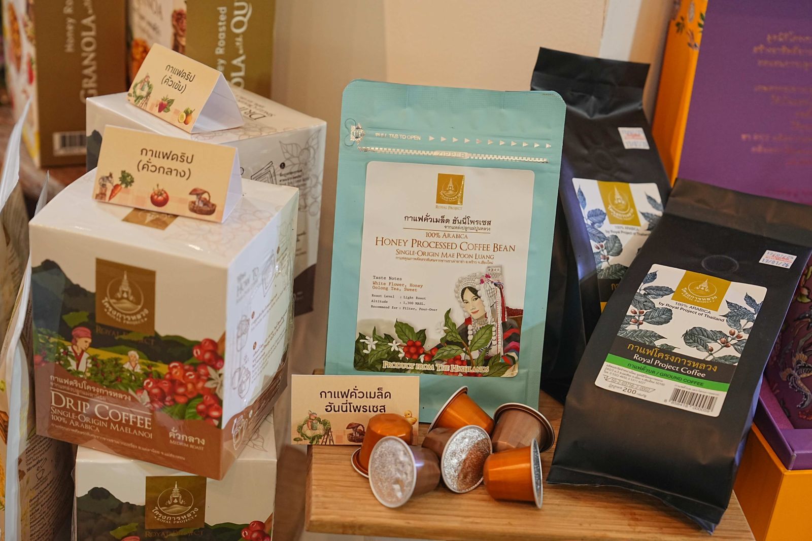 ภายในงานเตรียมพบกับผลิตผลและผลิตภัณฑ์จากเกษตรกรบนพื้นที่สูง กว่า 3,000 รายการ ส่งตรงจากยอดดอย นำโดย 9 สินค้าไฮไลต์ ได้แก่ 1)ข้าวโพดข้าวเหนียวสวีทแฟนตาซี, 2) องุ่น 3 สี 3) เห็ดพ็อตโตเบลโล่ 4) กุหลาบพันธุ์รอยัล 7 5) ชุดปลูกผักไฮโดรโพนิคส์ครบเซ็ตพร้อมปลูก 6) กุหลาบกระถางดอกหอม 7) น้ำแร่ธรรมชาติโครงการหลวง 8) ผลิตภัณฑ์จากกัญชง ผสมฝ้าย/เส้นใยรีไซเคิล 9) กรีกโยเกิร์ตนมแพะ พลาดไม่ได้ เมนูอร่อยจาก Royal Project Kitchen, The Royal Project Ice Cream Parlour & Café ส่งตรงจากยอดดอย 39 แห่ง ใน 7 จังหวัดภาคเหนือ