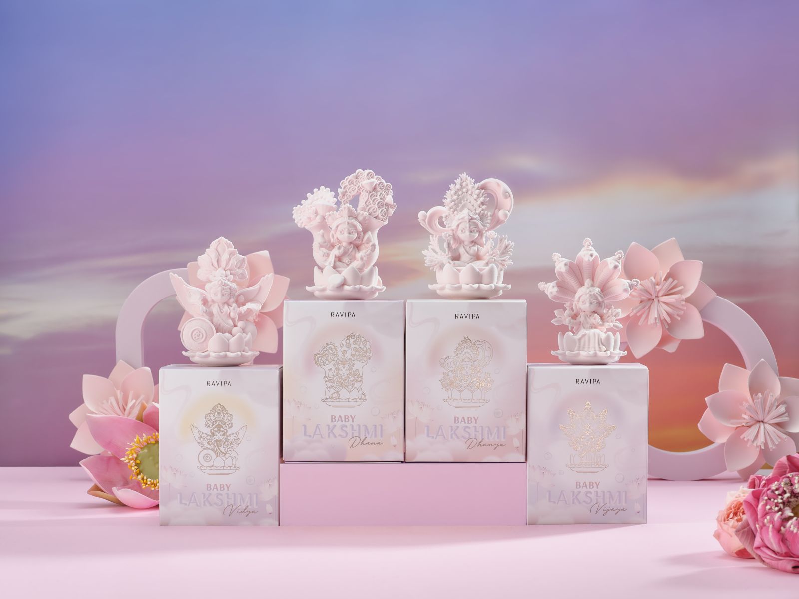 ครั้งนี้ RAVIPA ได้ถ่ายทอดพลังแห่งเทวีผู้ประทานพรผ่านงานออกแบบร่วมสมัยในรูปแบบ Art Toy ที่เข้าถึงได้ง่าย แต่ยังคงไว้ซึ่งความศักดิ์สิทธิ์และวิจิตรบรรจง ผลิตจากวัสดุระดับพรีเมียม พร้อมเคลือบผิวสัมผัสด้วยกำมะหยี่เนื้อนุ่ม เพื่อสะท้อนถึงความละมุนละไม ความประณีต และพลังแห่งพรในทุกมิติของการออกแบบ โดยแบ่งออกเป็น 4 ปางความหมายลึกซึ้ง ได้แก่ Dhanya Lakshmi Art Toy (พระแม่ลักษมีปางธัญญลักษมี) เทวีผู้ประทานความอุดมสมบูรณ์ มีกินมีใช้ ไม่สิ้นสุด Dhana Lakshmi Art Toy (พระแม่ลักษมีปางธนลักษมี) เทวีผู้ประทานทรัพย์สิน ความมั่งคั่ง และความร่ำรวย Vijaya Lakshmi Art Toy (พระแม่ลักษมีปางวิชัยลักษมี) เทวีผู้ประทานชัยชนะ ความสำเร็จ และความแคล้วคลาด Vidya Lakshmi Art Toy (พระแม่ลักษมีปางวิทยลักษมี) เทวีผู้ประทานปัญญา การศึกษา และความเจริญในหน้าที่การงาน