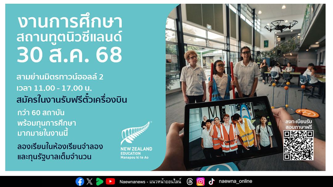 กลับมาแล้ว งานการศึกษาต่อสถานทูตนิวซีแลนด์ New Zealand Education Fair 2025 งานใหญ่ประจำปีที่รวมทุกคำตอบเรื่องเรียนต่อนิวซีแลนด์ไว้ในงานเดียว ขอเชิญนักเรียน นักศึกษา พ่อแม่ผู้ปกครอง และผู้สนใจไปร่วมสัมผัสการเรียนรู้แบบนิวซีแลนด์ สร้างอนาคตที่แตกต่างในประเทศแห่งการศึกษาโลก พบกับกว่า 65 สถาบันการศึกษาชั้นนำจากนิวซีแลนด์ครบทุกระดับทั้งมัธยม มหาวิทยาลัยครบทุกแห่ง สถาบันเทคโนโลยี และสถาบันภาษา ที่มาให้คำแนะนำปรึกษาแบบต้วต่อตัว สมัครเรียนในงานรับฟรีตั๋วเครื่องบิน พร้อมรับสิทธิพิเศษและทุนการศึกษาจากหลากหลายสถาบัน มูลค่าสูงสุดกว่า 2 ล้านบาท พร้อมประกาศข่าวดีทุนรัฐบาลนิวซีแลนด์ (เต็มจำนวน ไม่ต้องใช้ทุน) ในวันเสาร์ที่ 30 สิงหาคม 2568 เวลา 11:00 น. - 17:00 น. ณ ชั้น 5 สามย่านมิตรทาวน์ฮอลล์ 2 ถนนพระรามที่ 4 เขตปทุมวัน กรุงเทพฯ