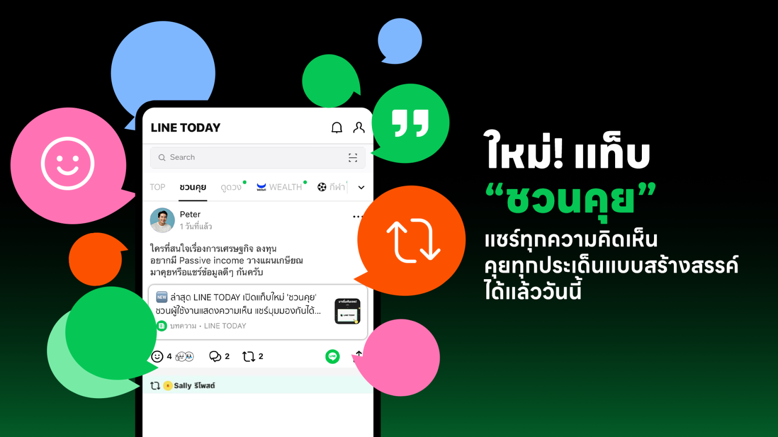 แท็บ “ชวนคุย” ต่อยอดจากอินไซต์การใช้งาน LINE TODAY ที่พบว่า ผู้ใช้งานคนไทยชื่นชอบการมีส่วนร่วมกับคอนเทนต์อย่างมาก ไม่ว่าจะเป็น การแชร์ การคอมเมนต์ ที่มีสถิติสูงถึง 2.1 ล้านครั้งต่อเดือน หรือการกดไอคอน