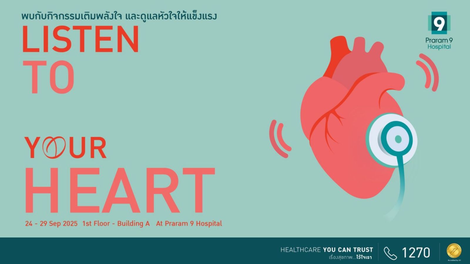 ผู้ที่สนใจเข้าร่วมกิจกรรม “LISTEN TO YOUR HEART” ระหว่างวันที่ 24-29 กันยายน สามารถเข้าร่วมฟรี ไม่มีค่าใช้จ่าย สอบถามรายละเอียดได้ที่ โทร.1270 หรือ Website: www.praram9.com / Line: lin.ee/vR9xrQs หรือ @praram9hospital และ Facebook: Praram9 Hospital