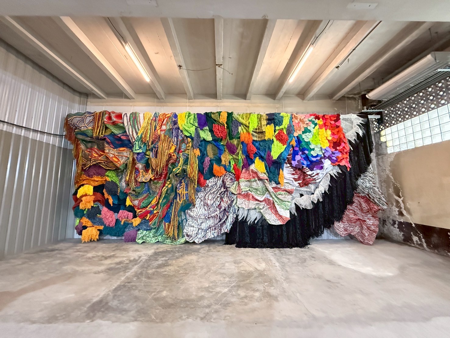 บางกอก คุนส์ฮาเลอ นำเสนอนิทรรศการเดี่ยว ‘Mitta del Santi’ โดย มุก เพลินจันทร์ วิญญรัตน์ หนึ่งในศิลปินสิ่งทอแนวหน้าของไทย ผลงานจัดวางชิ้นนี้ถือเป็นงานที่ยิ่งใหญ่และมีความทะเยอทะยานที่สุดเท่าที่เพลินจันทร์เคยทำมา ผ่านการตีความการทอผ้าขึ้นใหม่ให้เป็นทั้งทักษะฝีมือและความร่วมมือของชุมชน พร้อมทั้งนำประวัติศาสตร์ของบางกอก คุนส์ฮาเลอ ซึ่งเคยเป็นโรงพิมพ์ไทยวัฒนาพานิช มาเป็นแรงบันดาลใจ ผลงานนี้ได้มอบชีวิตใหม่ให้กับเศษผ้าจากงานสิ่งทอชิ้นก่อนๆ โดยแต่ละองค์ประกอบถูกนำมาตีความและประกอบขึ้นใหม่ เพื่อให้รูปทรง พื้นผิวและสีสันได้กลับมาเชื่อมโยงกันในบริบทใหม่ผ่านวิธีที่เหนือความคาดหมาย