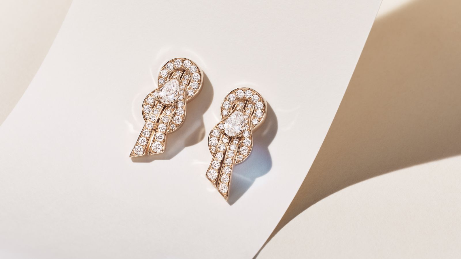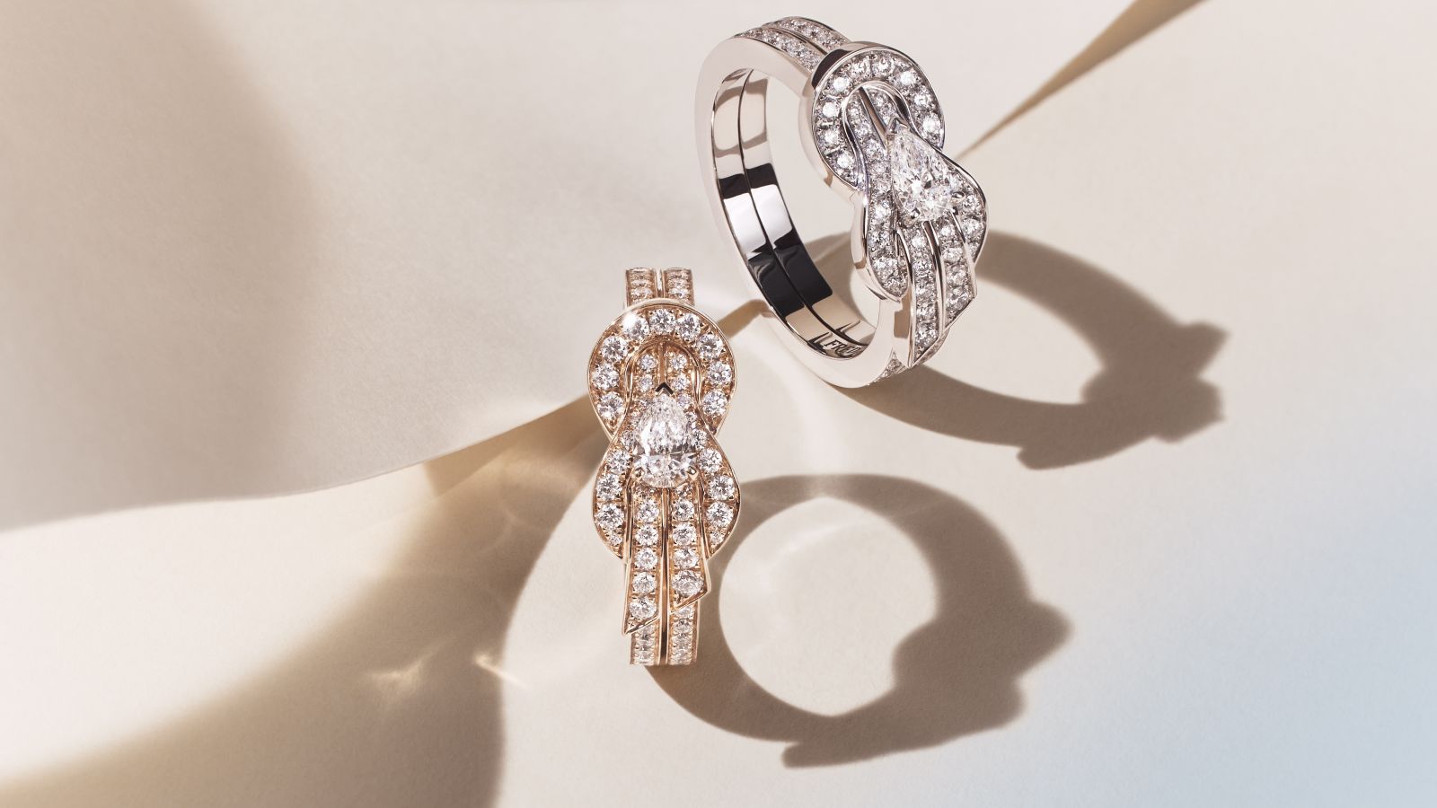 ทองคำสีไวท์โกลด์และทองคำสีพิงค์โกลด์ถูกเผยความงดงามผ่านเครื่องประดับ 3 ชิ้น ได้แก่ แหวน สร้อยคอ และต่างหู ซึ่งถ่ายทอดเสน่ห์อันสดใสของ Chance Infinie ได้อย่างลงตัว สามารถสวมใส่ในรูปทรงเลข 8 หรือหมุนกลับด้านเป็นสัญลักษณ์อินฟินิตี้ โดดเด่นด้วยเพชรทรงหยดน้ำเม็ดกลางรายล้อมด้วยเพชรพาเว่ เส้นสายโค้งมนพลิ้วไหวชวนให้สวมใส่ได้ในทุกวัน พร้อมเติมประกายอย่างเป็นธรรมชาติให้กับผิว