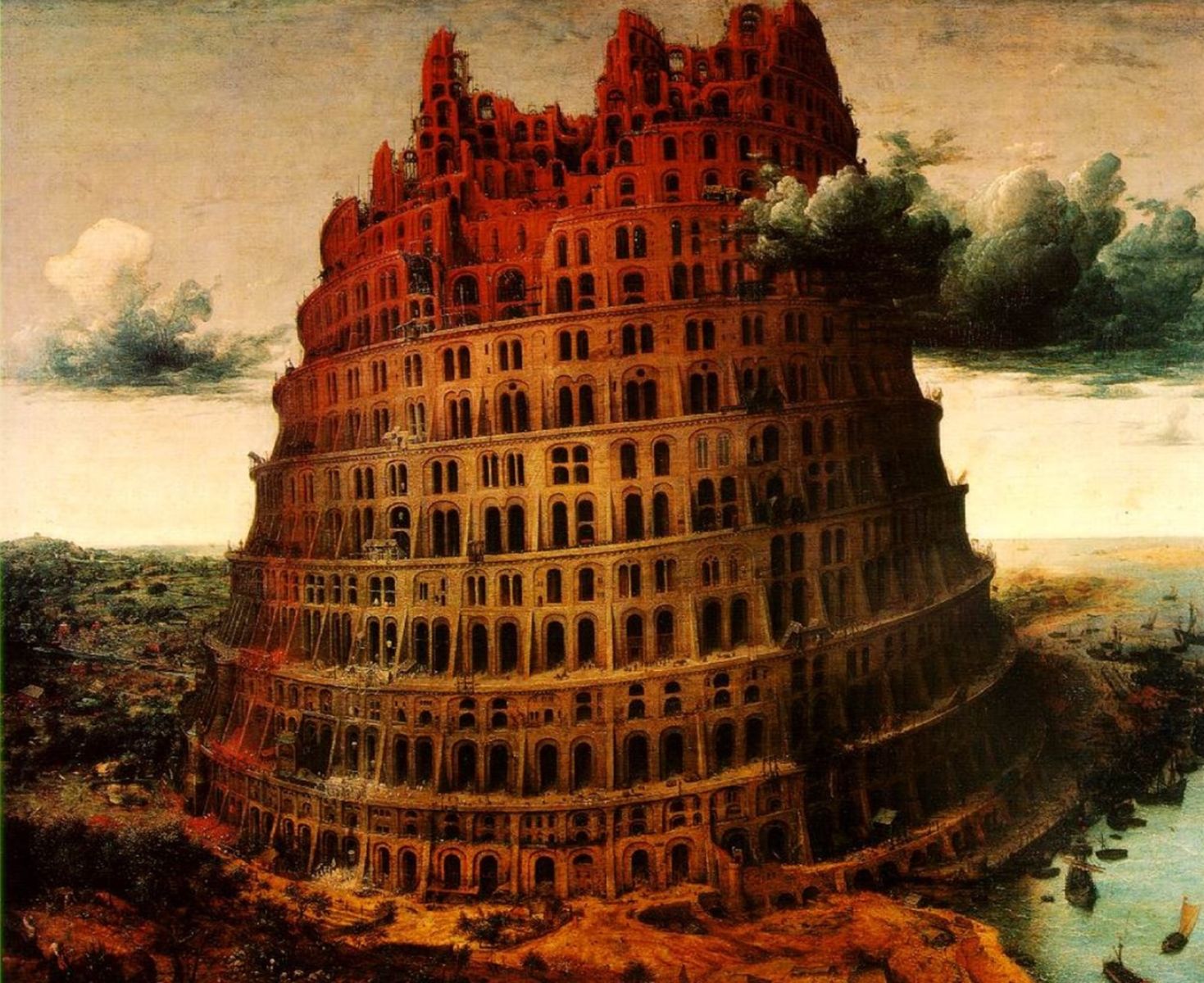 Tower of Babel ที่มักเป็นหัวข้อในงานจิตรกรรมนั้นมีต้นกำเนิดในพระคัมภีร์ไบเบิล นั่นคือสิ่งก่อสร้างในดินแดนบาบิโลนที่ถูกกล่าวถึงใน ปฐมกาล 11:1-9 ว่าเป็นหอคอยที่ถูกสร้างขึ้นโดยชนชาติที่มีภาษาเดียวเพื่อแสดงให้เห็นถึงความสำเร็จและต้องการป้องกันความแตกแยก พวกเขาจึงตั้งเป้าว่าจะสร้างเมืองของตัวเองและสร้างหอคอยให้ไปถึงจุดสูงสุดของสวรรค์เพื่อประกาศศักดาของชนชาติตน ไม่เช่นนั้นพวกเขาอาจแตกกระจายไปตามพื้นที่ต่าง ๆ บนโลก พระเจ้าเลยทำโทษความไร้สาระของพวกเขาด้วยการทำให้พวกเขาสับสนกับภาษาที่ใช้ระหว่างกันเกิดเป็นหลากหลายภาษาจนไม่สามารถที่จะสื่อสารกันได้