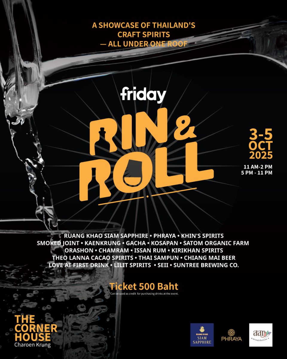 เตรียมพบกับภูมิปัญญาการกลั่น หมักและผลิตเครื่องดื่มแอลกอฮอล์จากทั่วไทย ในงาน ‘Rin & Roll’ที่รวบรวมแบรนด์น้ำเมาไทยจากหลากหลายพื้นที่ทั่วประเทศ ระหว่างวันที่ 3–5 ตุลาคมนี้ ณ ชั้น 2 The Corner House ถนนเจริญกรุง ย่านตลาดน้อย