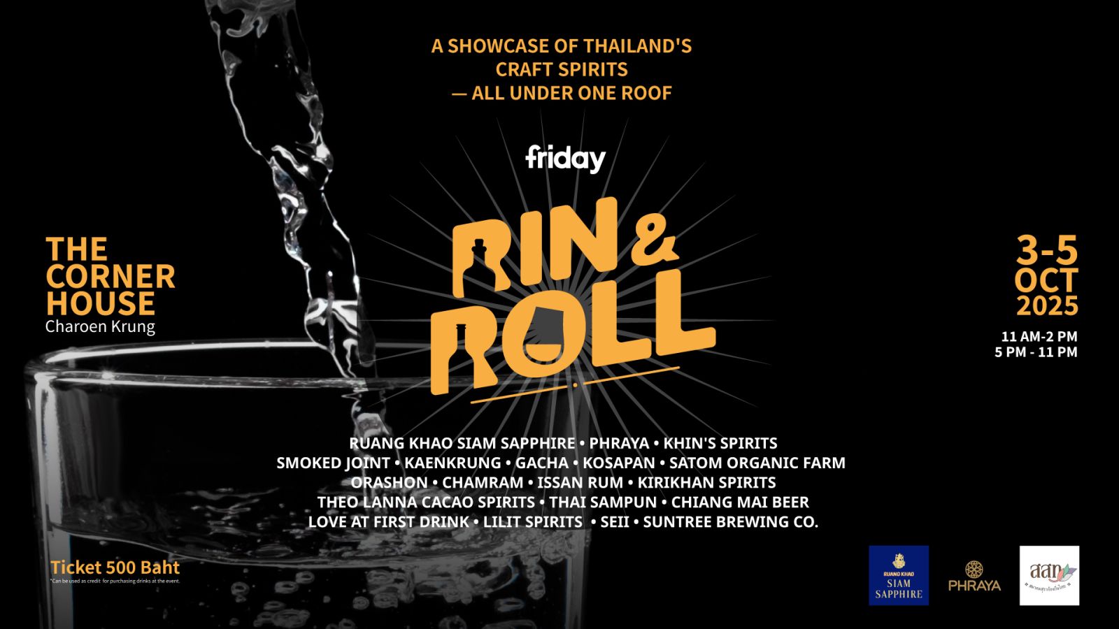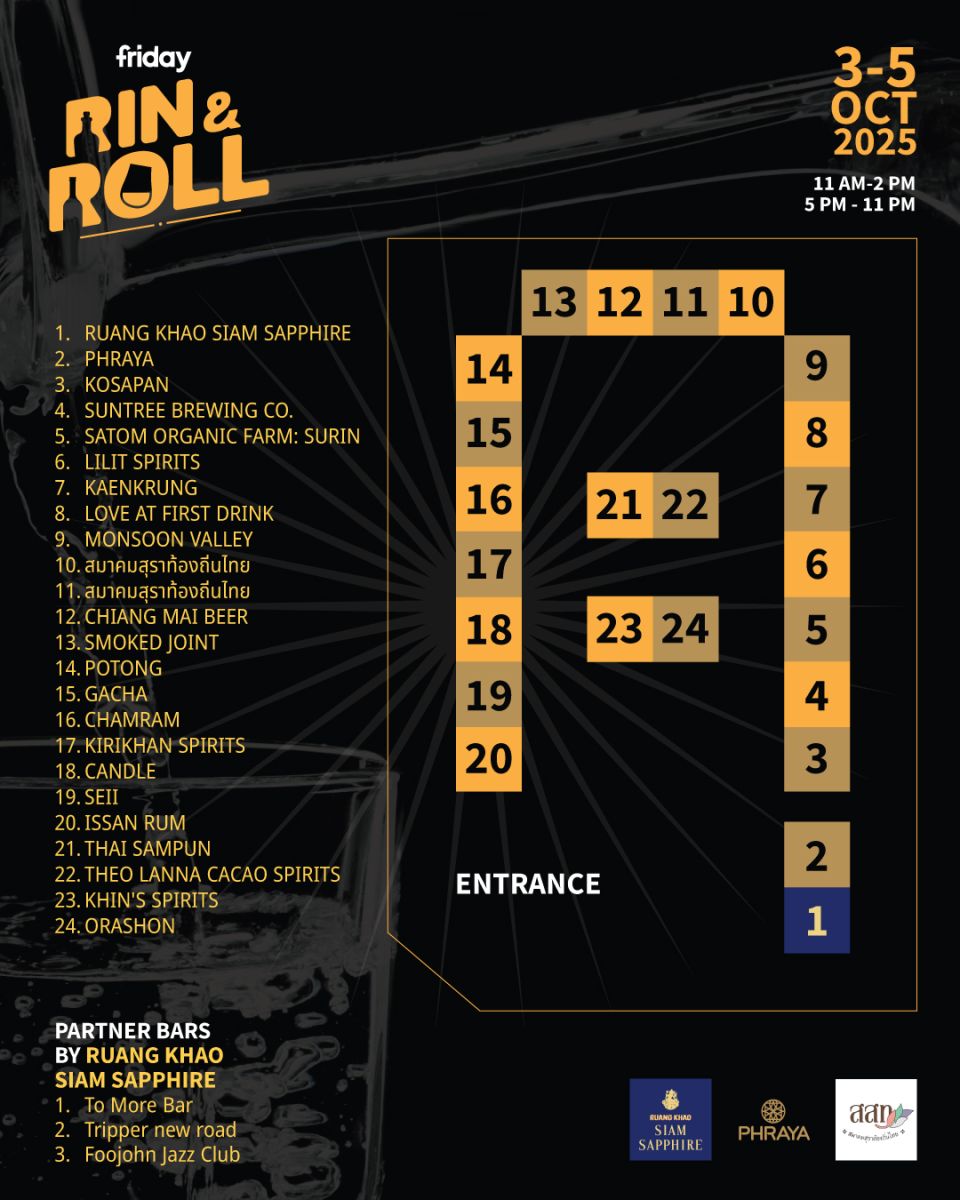 งานนี้ยังมีการจับมือกับ 3 บาร์ในย่านเจริญกรุง Tripper, To More, และ Foojohn สร้างสรรค์เครื่องดื่มพิเศษร่วมกับ RUANG KHAO SIAM SAPPHIRE ตลอดช่วงการจัดงาน Rin & Roll จัดขึ้นระหว่างวันที่ 3–5 ตุลาคม 2568 ณ ชั้น 2 The Corner House ถนนเจริญกรุง ย่านตลาดน้อยบัตรราคา 500 บาท รับแก้วเทสติงสำหรับเข้าชมได้ทุกบูธ และเครดิต 200 บาทสำหรับใช้จ่ายในงาน
