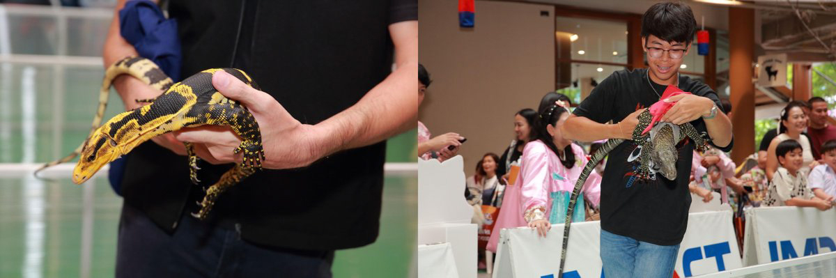 เสียงเฮดังสนั่นทันทีที่เปิดสนาม Come Here Baby กิจกรรมที่ทำเอาผู้ชมทั้งงานต้องเบิกตากว้างเมื่อผู้เข้าแข่งขันที่พากันวิ่งลงสนามคือ มอนิเตอร์ลิซาร์ด หรือที่หลายคนคุ้นชื่อว่า “ตัวเงินตัวทอง” เหล่าเพื่อนรักสายเลื้อยที่พร้อมใจกันออกวิ่งสุดแรงเกิด แม้จะดูยึกยัก แต่เต็มไปด้วยความตั้งใจ ทุกก้าวที่เคลื่อนไปข้างหน้าทำเอาคนดูทั้งขำ ทั้งเอ็นดู พร้อมส่งเสียงเชียร์ให้กำลังใจไม่ขาดปาก กลายเป็นหนึ่งในโมเมนต์ไฮไลท์ที่ใครได้อยู่ตรงนั้นต่างพูดเป็นเสียงเดียวกันว่า น่ารักเกินต้าน! ส่วนอีกหนึ่งกิจกรรมที่เรียกเสียงหัวเราะและความประทับใจจากผู้ร่วมงานคือ คู่แข่งต่างสายพันธุ์ในตำนาน “กระต่ายปะทะเต่า” ที่ถูกยกจากนิทานคลาสสิกมาโลดแล่นบนสนามจริง กระต่ายตัวจิ๋ววิ่งปรู๊ดปร๊าดสวนทางกับเต่าที่ค่อย ๆ เดินอย่างมั่นคง เสียงหัวเราะดังขึ้นทุกครั้งที่เห็นภาพความต่างสุดขั้วที่ลงตัวอย่างน่าเอ็นดู ที่สำคัญคือผลการแข่งขันไม่ได้มีใครแพ้ใครชนะขาด เพราะแต่ละรอบต่างผลัดกันคว้าชัย สร้างสีสันแบบ ไม่มีใครน้อยหน้าใคร กลายเป็นเวทีแห่งความสุขที่ทุกคนปรบมือให้ทั้งกระต่ายและเต่าอย่างเท่าเทียม ความสนุกยังต่อเนื่องกับการประกวดสุดครีเอตทั้ง หมาเลียไวได้ใจโอปป้า และ แมวเลียแดนกิมจิ ที่เหล่าเพื่อนรักสี่ขาต่างแต่งตัวจัดเต็มในสไตล์เกาหลี พร้อมโชว์ความน่ารักและแข่งขันกินขนมกันอย่างสนุก สนานจนผู้ชมอดยิ้มตามไม่ได้ งานนี้บอกได้คำเดียวว่า สนุกจนลืมเวลา!