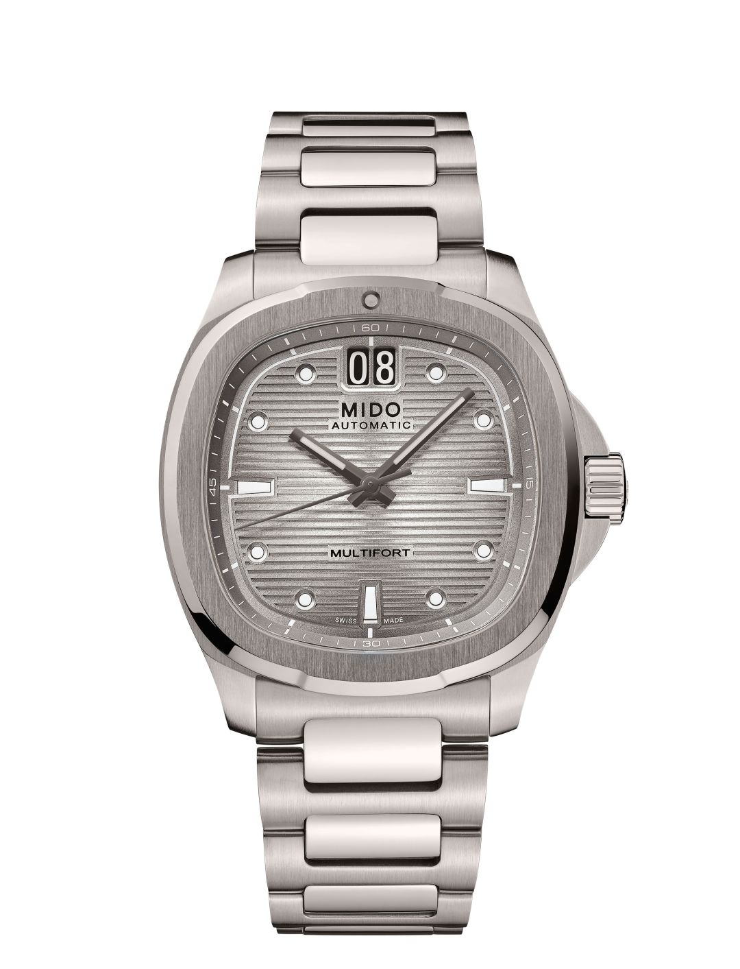 สำหรับเรือนเวลาดีไซน์ใหม่ล่าสุดจาก มิโด (MIDO) ในคอลเลกชั่น มัลติฟอร์ท ทีวี บิ๊ก เดท ไทเทเนียม (Multifort TV Big Date Titanium) นำเสนอรูปลักษณ์ที่โดดเด่นในทุกมิติ ผ่านวัสดุไฮเทคระดับพรีเมียมอย่างไทเทเนียม (Titanium) มาพร้อมหน้าปัดทีวีสุดคลาสสิกที่กลับมาโลดแล่นอีกครั้งเพื่อตอกย้ำความสำเร็จของ มัลติฟอร์ท ทีวี บิ๊ก เดท (Multifort TV Big Date) โดยคอลเลกชั่นนี้มาพร้อมตัวเรือนไทเทเนียมขัดซาตินที่เพิ่มความหรูด้วยการขัดเงาที่ข้อต่อตรงกลาง ตัวสายถูกออกแบบให้เชื่อมต่ออย่างกลมกลืนกับตัวเรือน ด้วยหน้าปัดขนาด 40 มิลลิเมตร โดดเด่นด้วยการไล่เฉดสีเทาเงินในโทนโมโนโครม และตกแต่งด้วยเทคนิคซันเรย์ขัดซาตินพร้อมลายเส้นแนวนอนที่ละเอียดประณีต โดยมีช่องแสดงวันที่ขนาดใหญ่ (Big Date) ที่ตำแหน่ง 12 นาฬิกา ใช้ตัวเลขสีขาวบนพื้นดำเพื่อให้อ่านค่าได้อย่างชัดเจน และกรอบเบเซิลตกแต่งด้วยการพ่นทรายเพื่อเพิ่มมิติ