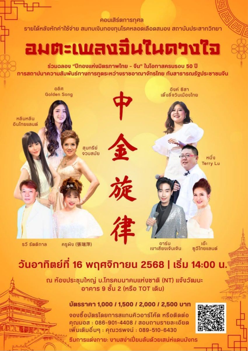 ชมรมดนตรีสยาม จัดคอนเสิร์ตการกุศล "อมตะเพลงจีนในดวงใจ” ร่วมเฉลิมฉลลองความสัมพันธ์ทางการทูตไทยจีนครบรอบ 50 ปี รายได้หลังหักค่าใช้จ่ายบริจาคสมทบเงินกองทุนโรคหลอดเลือดสมอง สถาบันประสาทวิทยา ซึ่งงานคอนเสิร์ตจะจัดขึนในวันอาทิตย์ที่16 พฤศจิกายน 2568 เวลา 14:00 น. ณ ห้องประชุม บ.โทรคมนาคมแห่งชาติ (NT) ถ.แจ้งวัฒนะ (หรือ TOT เดิม)