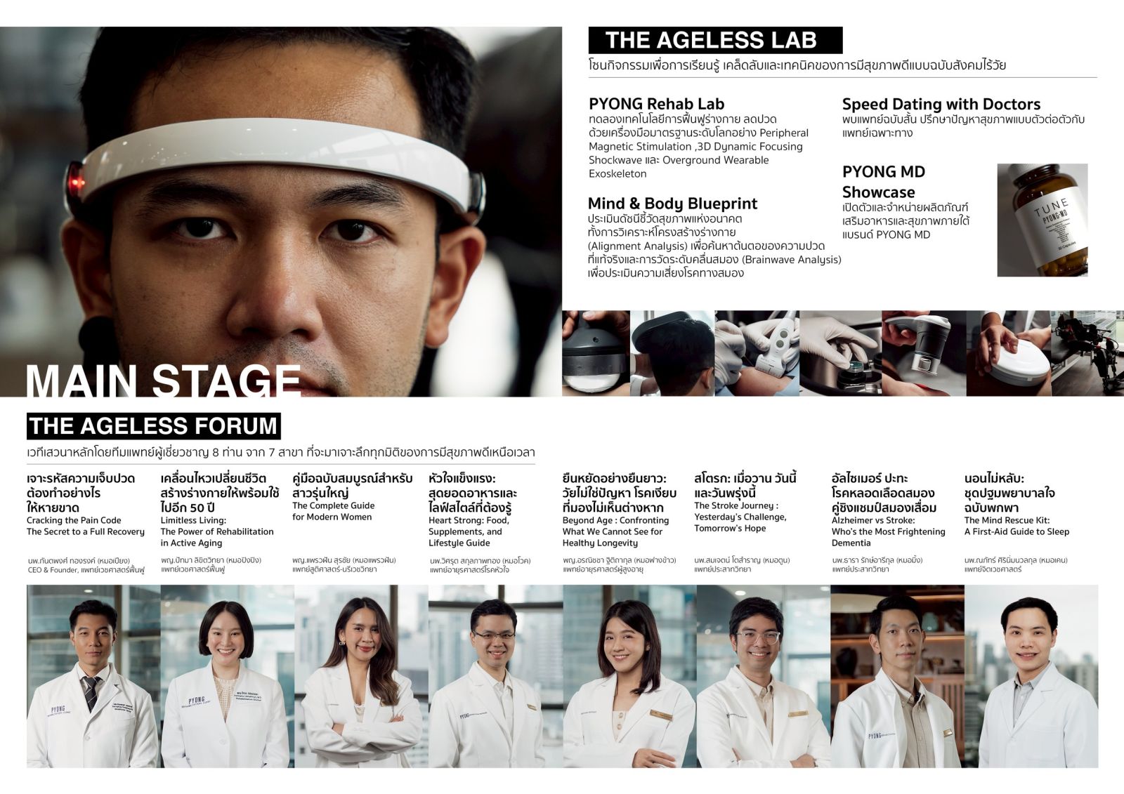 The Ageless Lab พบกับ PYONG Rehab Lab – ทดลองเทคโนโลยีฟื้นฟูและบรรเทาอาการปวด Mind & Body Blueprint – วิเคราะห์โครงสร้างร่างกายและสแกนสมอง Speed Dating with Doctors – ปรึกษาแพทย์แบบตัวต่อตัว PYONG MD Showcase – เปิดตัวผลิตภัณฑ์สุขภาพแบรนด์ PYONG MD Sponsor Showcase – โซนจัดแสดงผลิตภัณฑ์จาก 6 แบรนด์สุขภาพและไลฟ์สไตล์