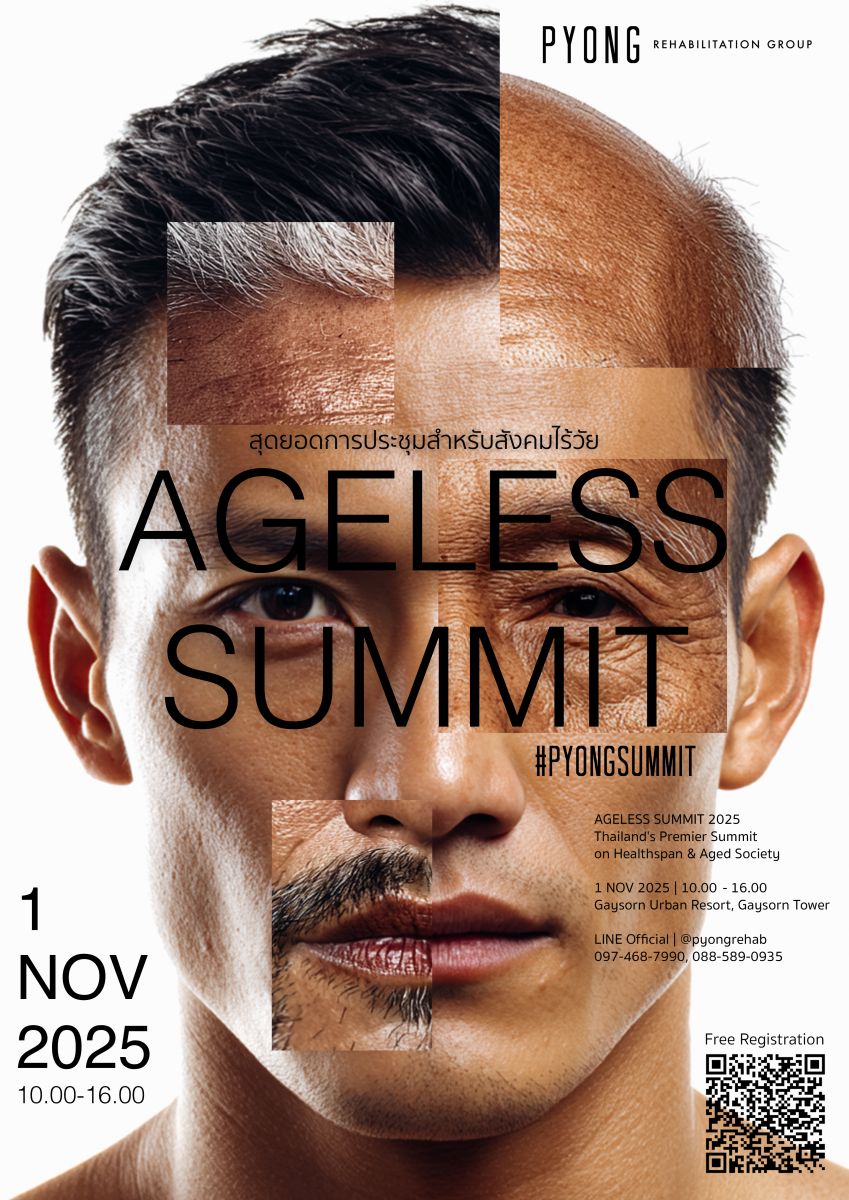 Ageless Summit 2025 ถือเป็นการต่อยอดจากความสำเร็จของ Office Syndrome Summit 2024 ที่จัดขึ้นเมื่อปีที่แล้ว และมีผู้สนใจเข้าร่วมงานอย่างล้นหลามจนเต็มทุกที่นั่ง อีกทั้งประเทศไทยกำลังจะก้าวเข้าสู่สังคมผู้สูงอายุอย่างสมบูรณ์ภายในปี 2568 PYONG Rehabilitation Group จึงตั้งใจจัดงานนี้ขึ้น เพื่อสร้างความเข้าใจ และเป็นแหล่งความรู้ให้กับผู้สนใจที่ต้องการมีสุขภาพที่ดี ก้าวสู่ความสูงวัยด้วยร่างกายที่แข็งแรงและมีประสิทธิภาพ