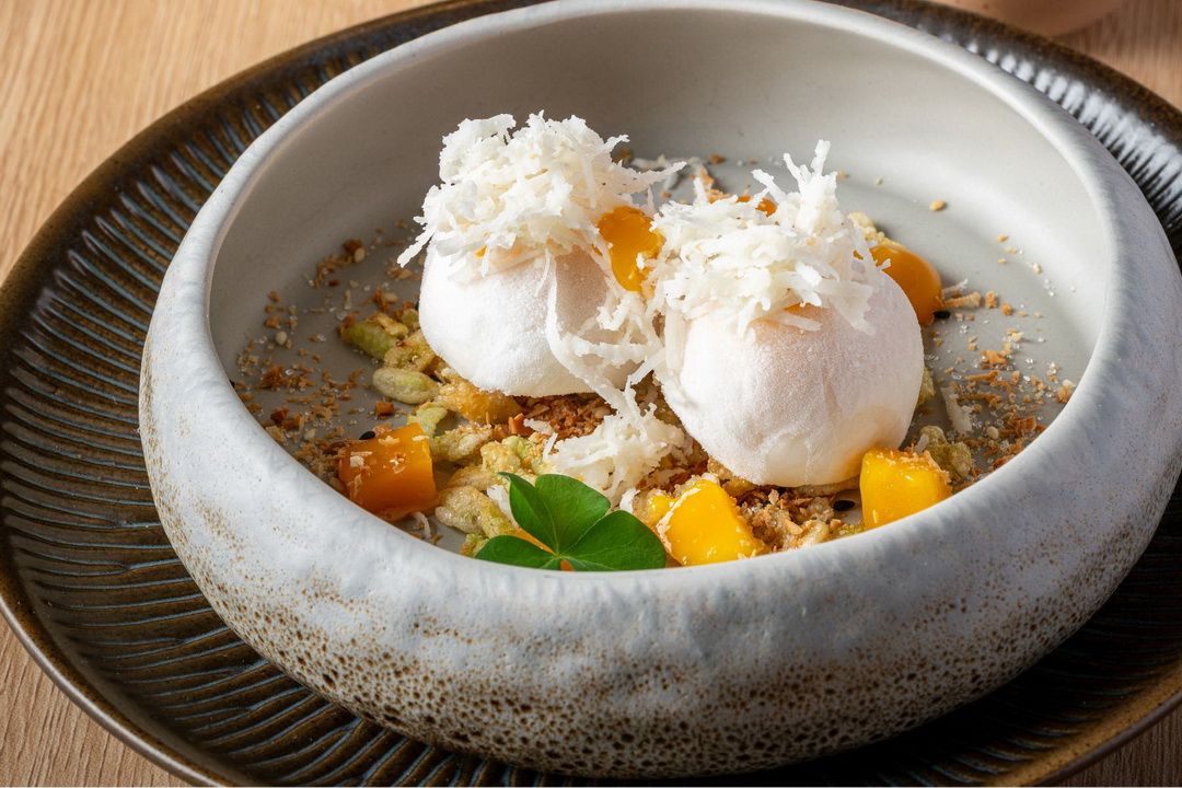 เมนูใหม่นี้ ยังนำเสนอขนมโบราณในความทรงจำอย่าง ขนมสี่ถ้วย ขนมมงคลที่ทำขึ้นเฉพาะในพิธีแต่งงานเพื่ออวยพรให้บ่าวสาวรักกันยืนยาว ข้าวเม่าไอศกรีมกล้วยไข่ ใช้ข้าวอ่อนที่คั่วจนหอม ใส่ไส้ด้วยกล้วยไข่ ทอดจนกรอบนอกนุ่มใน ทานคู่กับ ‘ไอติมกล้วยตาก’ ของดีขึ้นชื่อจากโครงการเกษตรอินทรีย์สนามบินสุโขทัย และขนมโคใส่ไส้ไอศกรีม สอดไส้ไอศกรีมมะม่วงมหาชนกจากโครงการเกษตรอินทรีย์สนามบินสุโขทัยเพิ่มความสดชื่นหอมหวาน