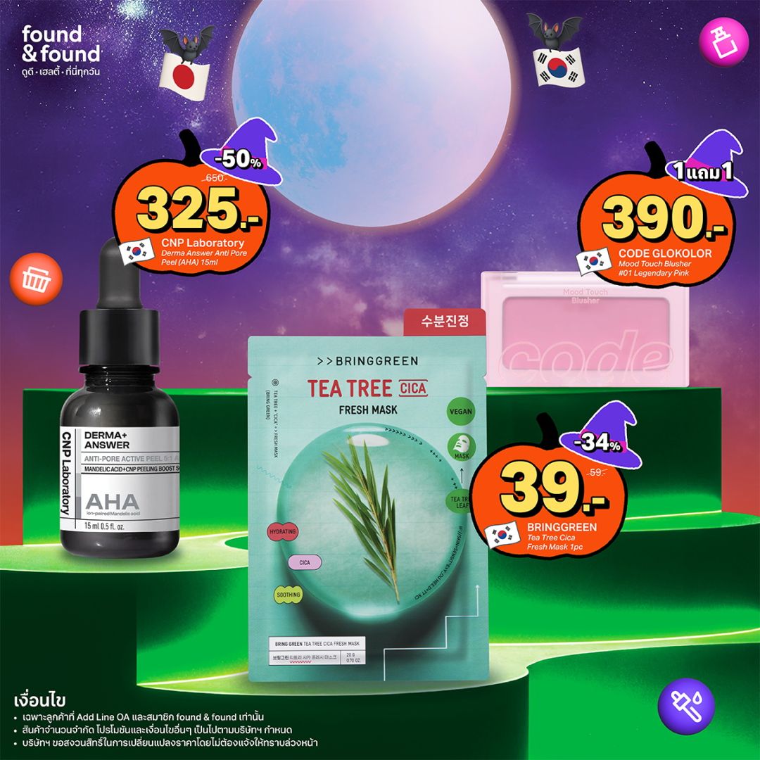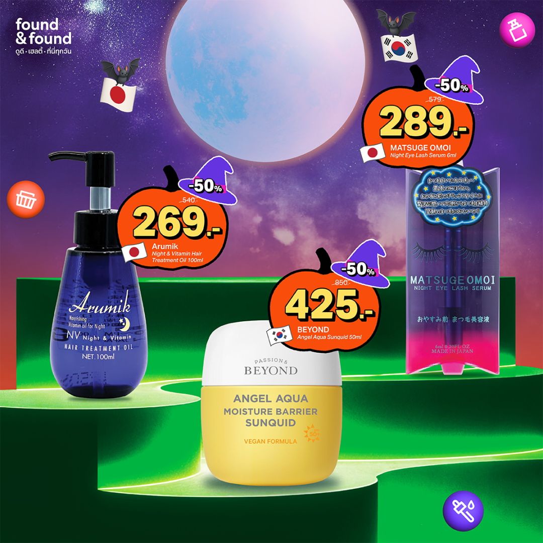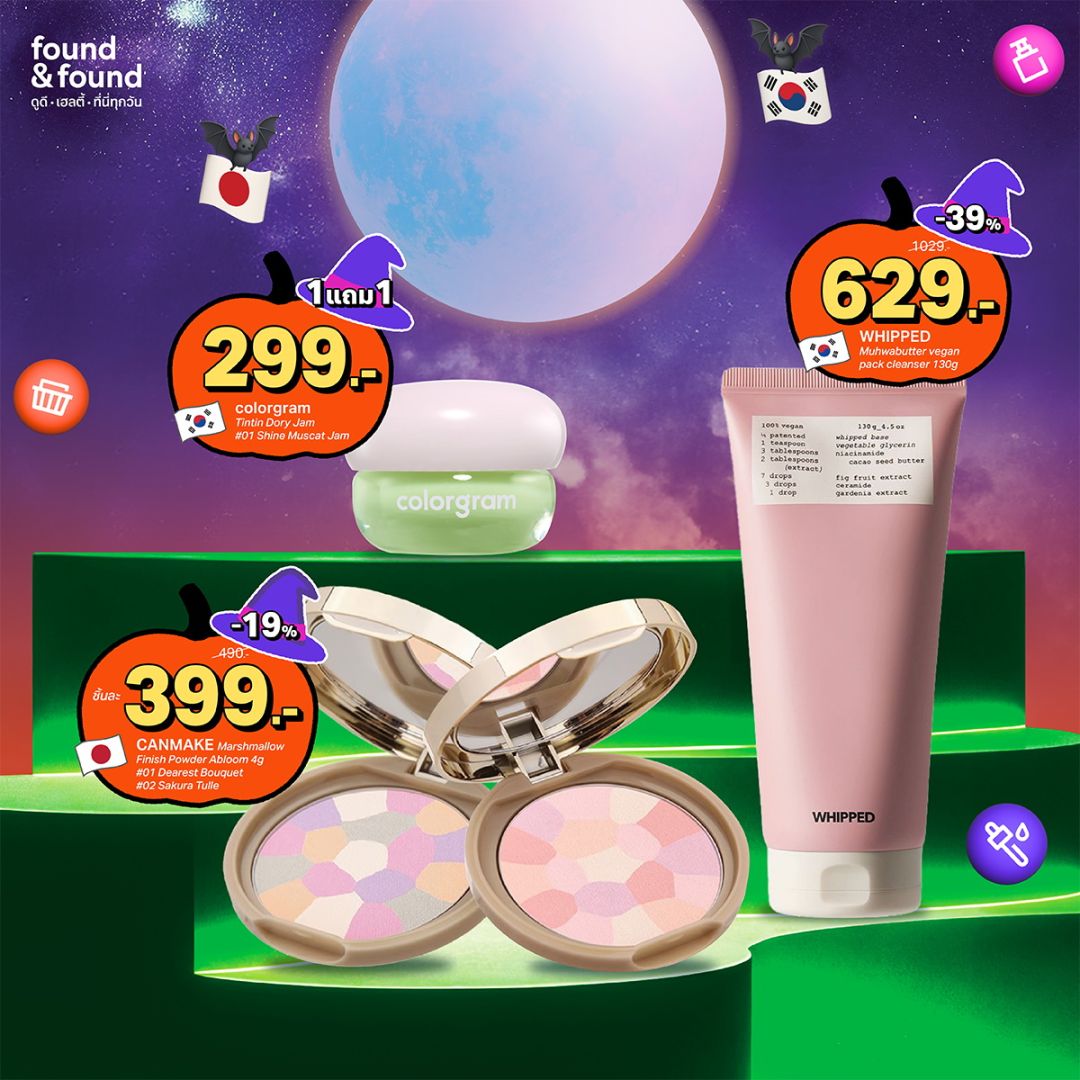 ใครอยากสวยเป๊ะรับฮาโลวีน แบบไม่มีโป๊ะ! ก็เตรียมลิสต์ให้พร้อมแล้วไปช้อปกับบิวตี้ไอเทมราคาพิเศษที่จะเสกความสวยรับวันหลอนให้คุณก่อนใคร ช้อปมันส์ยันคืนปล่อยผี กับบิวตี้ไอเทมยอดฮิตมากมายที่จะแลนด์ดิ้งจากญี่ปุ่นและเกาหลีมาให้เลือกช้อปกันแบบจุใจ มีครบทั้งสกินแคร์ เมคอัพ บอดี้โลชั่น แฮนด์ครีม เจลอาบน้ำ แชมพู และอื่น ๆ อีกเพียบ อาทิเช่น WHIPPED, colorgram, BEYOND, TEA TREE, CANMAKE, Arumik, Prieclat U, Jmella, MATSUGE OMOI และอีกมากมาย จัดหนักจัดเต็มรับฮาโลวีน โปรคุ้มแบบนี้…น้องผียังอยากช้อป! รีบมาช้อปรับวันหลอนได้แล้วที่ร้าน found & found ทุกสาขา ตั้งแต่วันที่ 1 - 31 ตุลาคม 2568 เท่านั้น!
