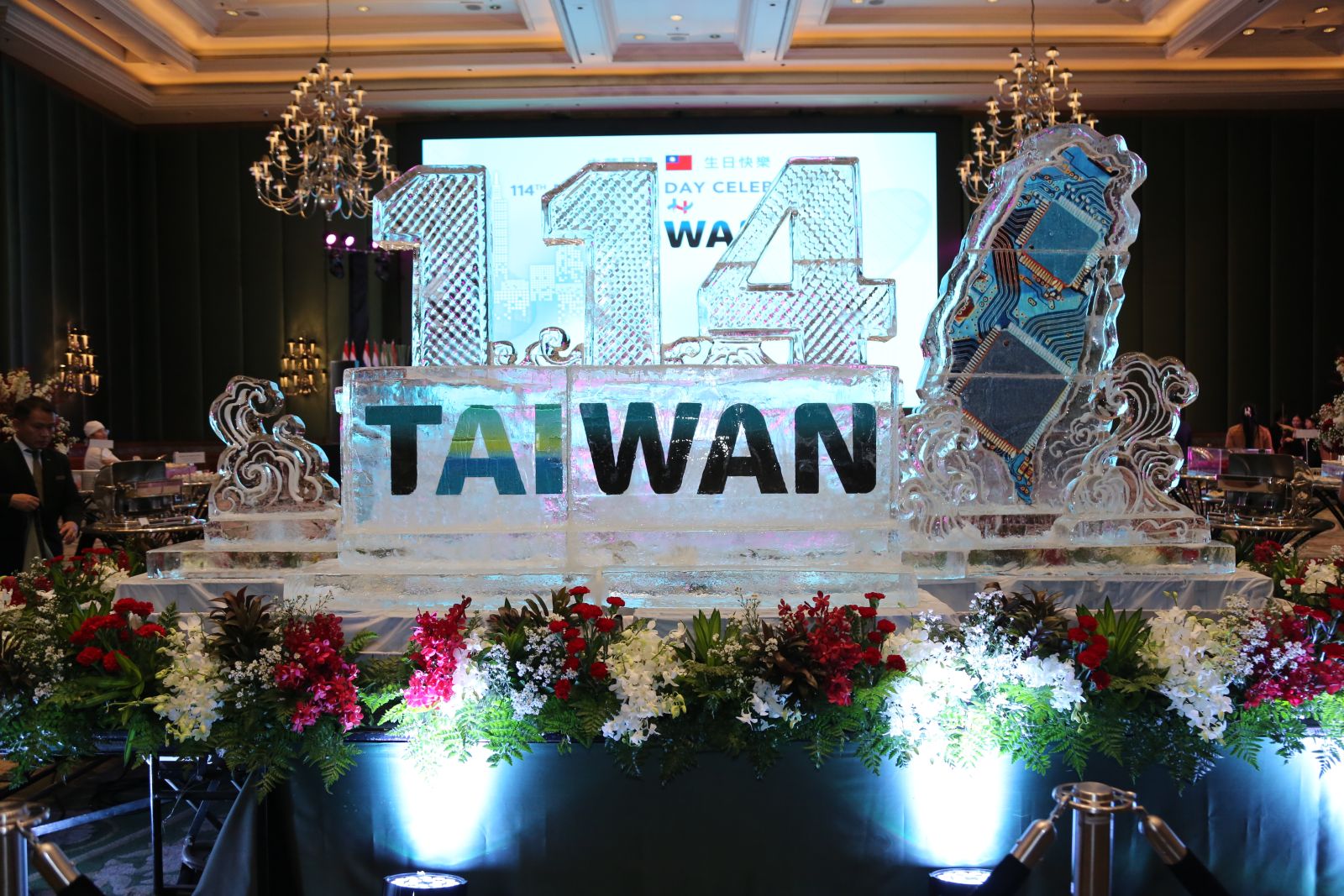ปีนี้ งานเลี้ยงได้รับการออกแบบฉากต้อนรับภายใต้แนวคิด “ความยืดหยุ่นของแผ่นเวเฟอร์เซมิคอนดักเตอร์ของไต้หวัน” โดยผสานภาพลักษณ์หลักของวันชาติร่วมกับอาคารไทเป 101 ซึ่งเป็นสัญลักษณ์สำคัญของไต้หวัน ส่วนประติมากรรมน้ำแข็งถูกออกแบบเป็นตัวเลข “114” โดยมีพื้นผิวตกแต่งด้วยลวดลายที่เลียนแบบแผ่นเวเฟอร์ ซึ่งเป็นวัสดุสำคัญในการผลิตชิปเซมิคอนดักเตอร์ คู่กับแผนที่ไต้หวันที่ฝังลวดลายแผงวงจรพิมพ์ (PCB) พร้อมเสริมองค์ประกอบคำว่า “TAIWAN” เพื่อเน้นย้ำบทบาทสำคัญของไต้หวันในห่วงโซ่อุตสาหกรรมเซมิคอนดักเตอร์ระดับโลก ตลอดจนสะท้อนถึงความมุ่งมั่นของรัฐบาลในการผลักดันให้ไต้หวันเป็น “เกาะแห่งปัญญาประดิษฐ์ (AI Island)” ซึ่งได้รับความสนใจจากแขกผู้ร่วมงานเป็นอย่างมาก และต่างพากันถ่ายภาพเป็นที่ระลึกอย่างคึกคัก