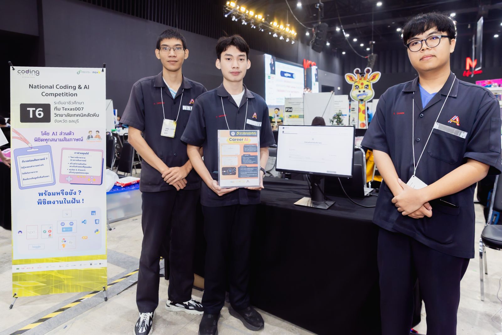 ชานน บุญประเสริฐ วิทยาลัยเทคนิคสัตหีบ ตัวแทนจากทีม Texas 007 เจ้าของโปรเจกต์ Career AI กล่าวว่า “พวกเราคิดโปรเจกต์ ‘Career AI’ เว็บไซต์สำหรับฝึกซ้อมสัมภาษณ์งานขึ้นมาเพื่อช่วยสนับสนุนการเตรียมความพร้อมก่อนสัมภาษณ์งาน โดยใช้ Gemini API เพื่อสร้างคำถามจาก Job description ที่ผู้ใช้งานป้อนข้อมูล และวิเคราะห์คำตอบพร้อมสรุปผล นอกจากนี้ยังใช้ TTS และ STT ในการจำลองการสัมภาษณ์งาน และวิเคราะห์สีหน้าระหว่างการซ้อมสัมภาษณ์ พร้อมให้คำแนะนำ โดยเราต้องการให้ ‘Career AI’ เป็นโค้ช AI ส่วนตัวที่จะช่วยให้ผู้ใช้พิชิตงานในฝันได้สำเร็จครับ และการได้รับรางวัล Best Idea ก็ทำให้มั่นใจว่า สิ่งที่เราคิดและลงมือทำสามารถสร้างประโยชน์ได้จริง เรียกว่าเป็นกำลังใจและแรงผลักดันให้พวกเราก้าวต่อไปครับ”