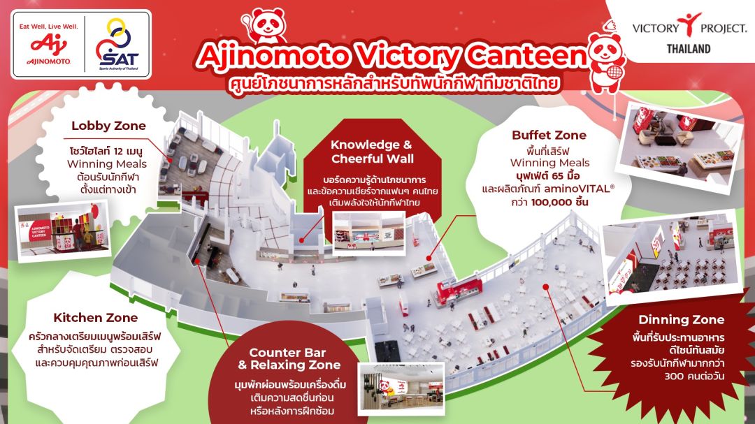 “Ajinomoto Victory Canteen” หรือศูนย์โภชนาการหลักสำหรับทัพนักกีฬาทีมชาติไทย จำนวน 230 ที่นั่ง เป็นทั้งพื้นที่รับประทานอาหารและพื้นที่ทำกิจกรรมสำหรับนักกีฬาทีมชาติไทย ออกแบบตามมาตรฐานระดับโลก เพื่อรองรับนักกีฬาได้กว่า 300 คนต่อวัน มีไฮไลต์คือ 12 เมนูพิ เศษ “มื้ออาหารแห่งชัยชนะ (Winning Meals)” ที่นำเมนูยอดนิยมของคนไทยมาครีเอทใหม่ตามแนวคิด ‘เรากินเพื่ออะไร?’ กับ 3 คอนเซ็ปต์โภชนาการที่ออกแบบมาเพื่อนักกีฬา ได้แก่ กินเพื่อคงสมดุล - มื้อเบา รักษาความบาลานซ์ / กินเพื่อเตรียมพร้อม - สะสมพลังงาน เตรียมซ้อม-แข่งวันต่อไป / กินเพื่อฟื้นฟู - ฟื้นฟูร่างกาย เติมพลังหลังใช้ร่างกายหนัก โดยผสานรสชาติที่คุ้นเคยกับโภชนาการอาหารเพื่อความอร่อยลงตัว โดยมื้ออาหารสุดพิเศษนี้เป็นการพัฒนาร่วมกันของเชฟนานา-มารีน่า และทีมนักโภชนาการของ Thailand Victory Project® ซึ่งมีโซเด็กซ์โซ่ ประเทศไทย ผู้นำระดับโลกด้านอาหารอย่างยั่งยืนจากฝรั่งเศส เป็นผู้ดำเนินการหลักในการจัดการอาหาร โดยพื้นที่ศูนย์โภชนาการฯ ยังประกอบด้วยโซนคาเฟ่ปลุกความรีเฟรชสำหรับนักกีฬา เวทีจัดโชว์ทำอาหารและกิจกรรมกับนักกีฬา และโซนผลิตภัณฑ์อะมิโนไวทัล® ที่ซัพพอร์ตผลิตภัณฑ์มากกว่า 100,000 ชิ้น เพื่อช่วยเรื่องการฟื้นตัวและชาร์จพลังให้แก่ทัพนักกีฬาไทย นอกจากนี้ นักกีฬายังสามารถใช้แอป พลิเคชัน i-LiveWell เพื่อวางแผนและติดตามโภชนาการเฉพาะบุคคล ให้สอดคล้องกับเป้าหมายด้านที่นักกีฬาต้องการได้อย่างมีประสิทธิภาพ