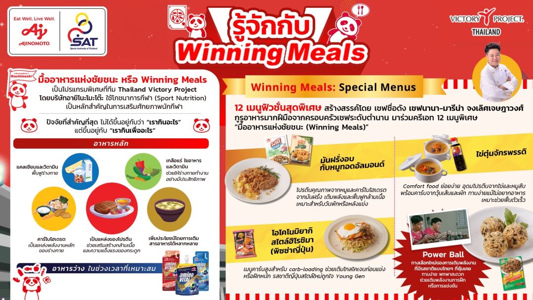 12 เมนูพิเศษ “มื้ออาหารแห่งชัยชนะ (Winning Meals)” เพื่อสร้างความประทับใจให้นักกีฬาในช่วงเตรียมความพร้อมสู่ซีเกมส์และอาเซียนพาราเกมส์ โดยตีความเมนูโปรดของคนไทยใหม่ให้สมดุลด้านโภชนาการ ครีเอทอาหารที่คุ้นเคยให้เป็นอาหารเพื่อสร้างชัยชนะ อาทิ มันฝรั่งอบกับหมูทอดและอัลมอนด์ - ชุดเสริมสร้างกล้ามเนื้อและเติมพลัง, โอโคโนมิยากิสไตล์ฮิโรชิมา พิซซ่าญี่ปุ่น - เมนูเน้นคาร์บเติมพลัง, ไข่ตุ๋นจักรพรรดิ – โปรตีนคอมฟอร์ตเพื่อการฟื้นตัวเร็ว และ เมนูข้าวปั้น Power Ball - เอเนอร์จี้บูสเตอร์สไตล์ไทยสำหรับพกพาระหว่างวัน