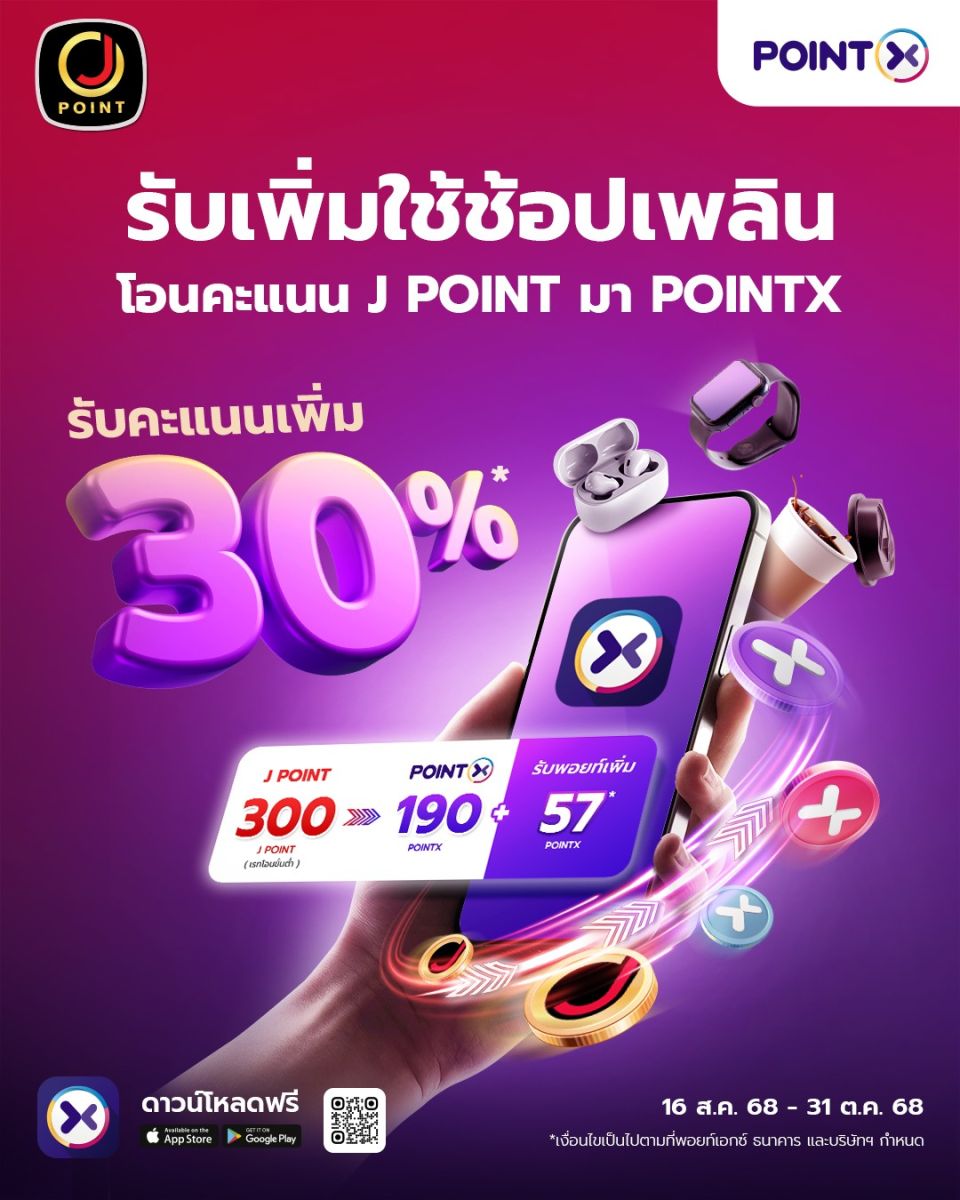 POINTX (พอยท์เอกซ์) แอปพลิเคชันรวมและแลกคะแนนสะสม ที่แลกง่าย ใช้คุ้ม เดินหน้าขยายพันธมิตรใหม่ เสริมแกร่งระบบสะสมคะแนนให้หลากหลายและครอบคลุมยิ่งขึ้น ล่าสุดประกาศความร่วมมือกับ J POINT (เจ พอยท์) ระบบสะสมคะแนนในกลุ่ม เจมาร์ท กรุ๊ป จัดโปรโมชันสุดคุ้มเอาใจนักสะสมพอยท์ ชวนสมาชิกโอน J POINT เป็น POINTX ด้วยโปร “รับเพิ่มใช้ช้อปเพลิน โอนคะแนน J POINT มา POINTX รับคะแนนเพิ่ม 30%” เพื่อเพิ่มทางเลือกในการใช้คะแนนให้หลากหลาย คุ้มค่า และสนุกยิ่งขึ้น พร้อมรับดีลดี ๆ และสิทธิประโยชน์มากมายจาก POINTX อย่าปล่อยให้คะแนนหมดอายุไปฟรี ๆ โอนมารับคะแนนเพิ่มกันได้ตั้งแต่วันที่ 16 สิงหาคม - 31 ตุลาคม 2568