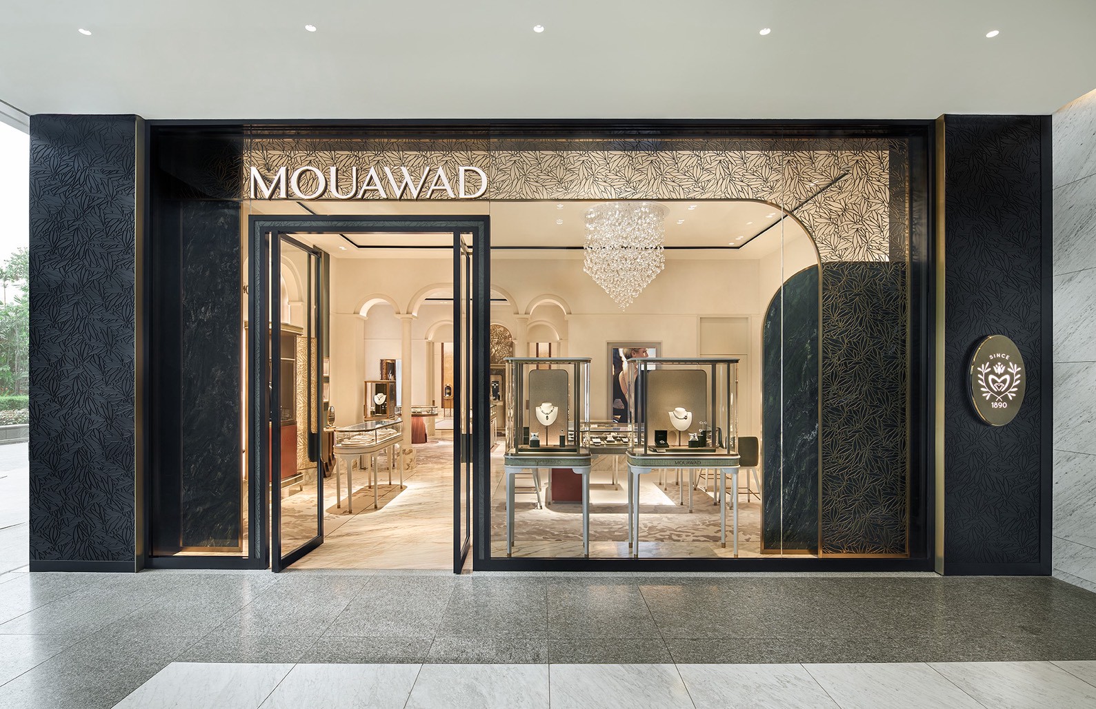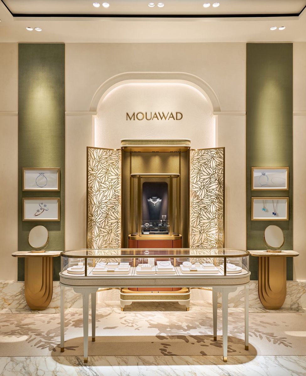 ภายในแบ่งเป็นหลายโซนที่สะท้อนศิลปะและมรดกของแบรนด์ ทั้งโซน Fine Jewelry, High Jewelry, Bridal, VIC, Event Room และ Heritage Room ซึ่งจัดแสดงผลงานระดับโลกและเรื่องราวกว่า 130 ปีของ Mouawad การออกแบบผสานความหรูหราและเอกลักษณ์ระดับสากล ผ่านวัสดุและองค์ประกอบที่ได้รับแรงบันดาลใจจากธรรมชาติและสถาปัตยกรรมแบบเลแวนท์ ตอกย้ำความมุ่งมั่นของ Mouawad ในการมอบประสบการณ์แห่งความงดงามเหนือกาลเวลาและความหรูหราที่เป็นเอกลักษณ์