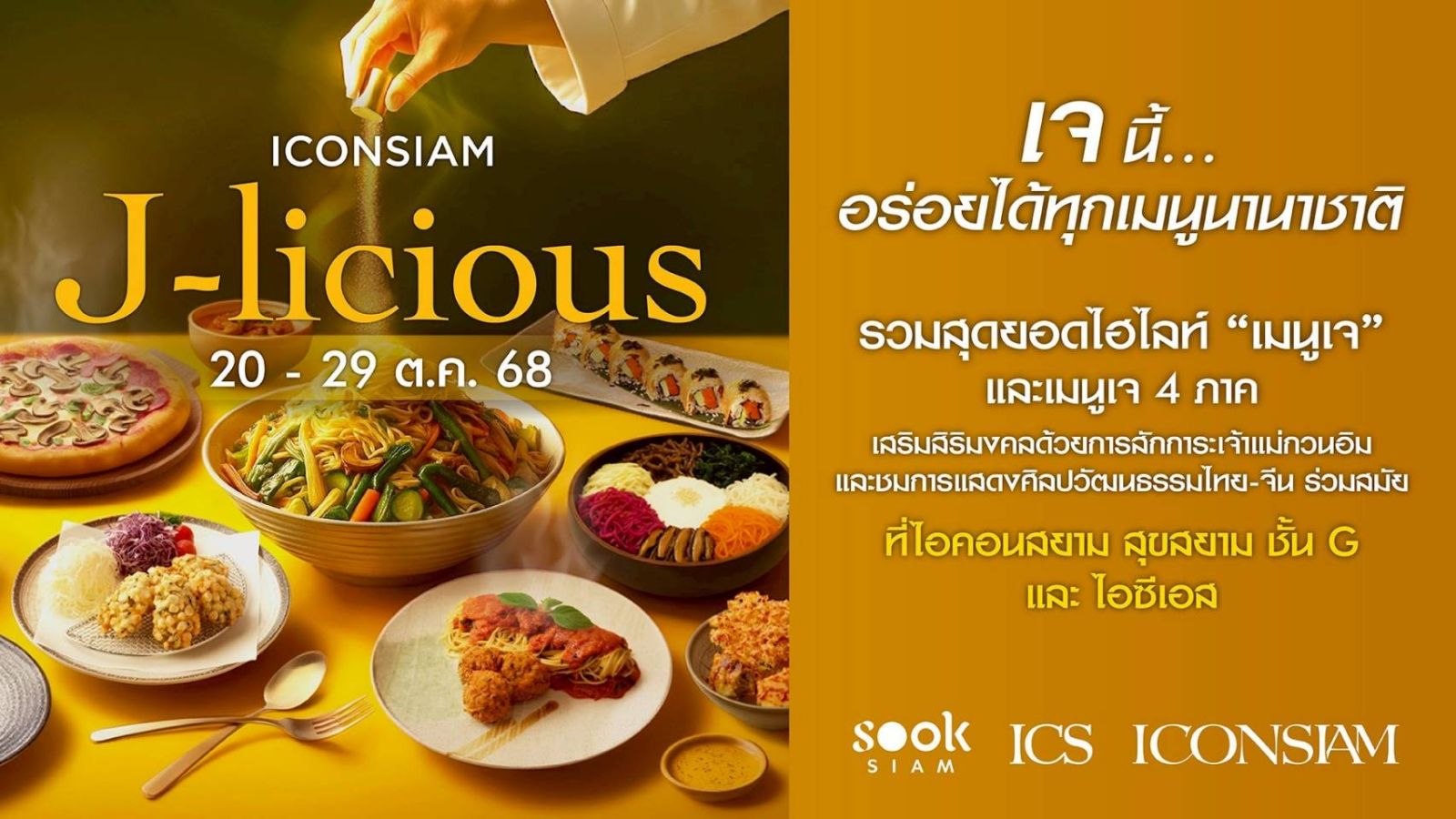 ไอคอนสยาม แลนด์มาร์กระดับโลกริมแม่น้ำเจ้าพระยา และเมืองสุขสยาม ต้อนรับเทศกาลกินเจปี2568 จัดงาน “J-licious เจนี้ อร่อยได้ทุกเมนูนานาชาติ” คัดสรรเมนูเจจากร้านดังทั่วไอคอนสยามมาให้เลือกอร่อยหลากหลาย ครบทุกสไตล์ทั้งไทย จีน ฝรั่ง พร้อมด้วยเมนูอาหารเจ 4 ภาค จนถึงเมนูเจฟิวชันที่รังสรรค์ในสไตล์เอเชียและยุโรป ณ เมืองสุขสยาม ให้สายบุญและคนรักสุขภาพได้อิ่มบุญ อิ่มใจ เพลิดเพลินกับรสชาติไม่ธรรมดาของเมนูเจ ท่ามกลางบรรยากาศริมแม่น้ำเจ้าพระยาของไอคอนสยาม ตลอดช่วงเทศกาลกินเจนี้ ตั้งแต่วันที่ 20-29 ตุลาคม 2568