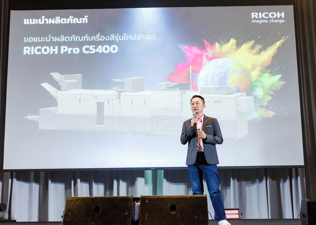 บริษัท ริโก้ (ประเทศไทย) จำกัด จัดงานเปิดตัวเครื่องพิมพ์ดิจิทัลระดับโปรดักชันรุ่นใหม่ล่าสุด “Ricoh Pro C5400S Series” อย่างเป็นทางการภายใต้คอนเซ็ปต์ “Where Color Meets Perfection – ที่สุดของสีสันสู่ความสมบูรณ์แบบ” ณ ห้องแกรนด์บอลรูม โรงแรมโฟร์ซีซั่นส์ กรุงเทพฯ ริมแม่น้ำเจ้าพระยา ภายในงานได้รับความสนใจจากผู้ประกอบการธุรกิจการพิมพ์ ผู้บริหาร ผู้เชี่ยวชาญในวงการ แขกผู้มีเกียรติ และพันธมิตรทางธุรกิจกว่า 200 คน เข้าร่วมงานอย่างคับคั่ง บรรยากาศเต็มไปด้วยความคึกคักและแรงบันดาลใจแห่งนวัตกรรมการพิมพ์ยุคใหม่