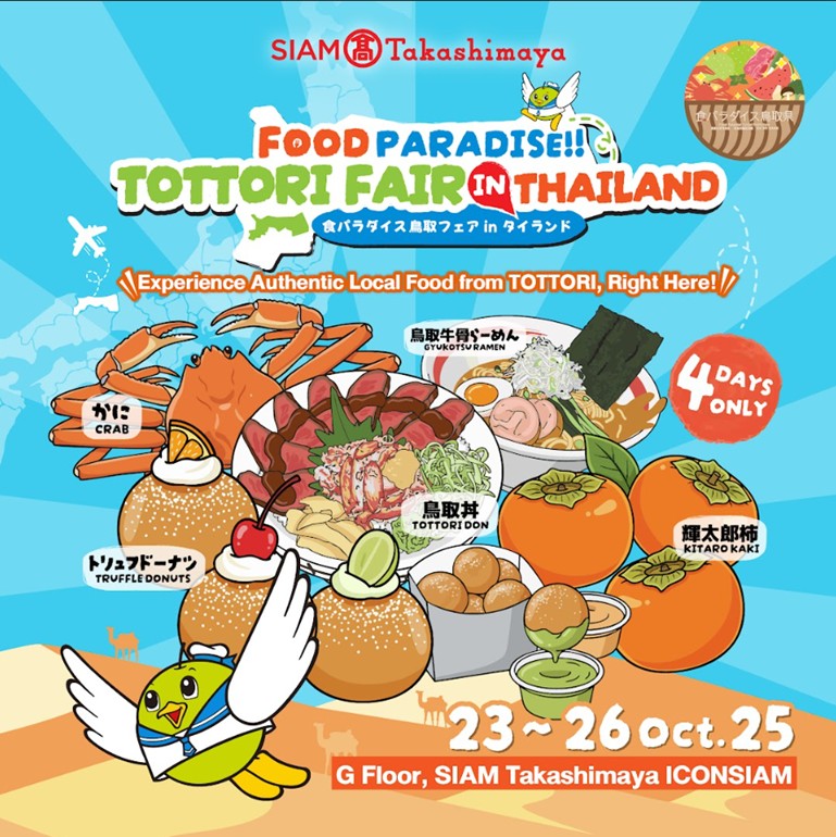 งาน ‘Food Paradise!! TOTTORI Fair in THAILAND’ จัดขึ้นเพียง 4 วันเท่านั้น ระหว่างวันที่ 23-26 ตุลาคม 2568 ณ โซน Rose Food Avenue ชั้น G ห้างฯ สยาม ทาคาชิมายะ ในไอคอนสยาม
