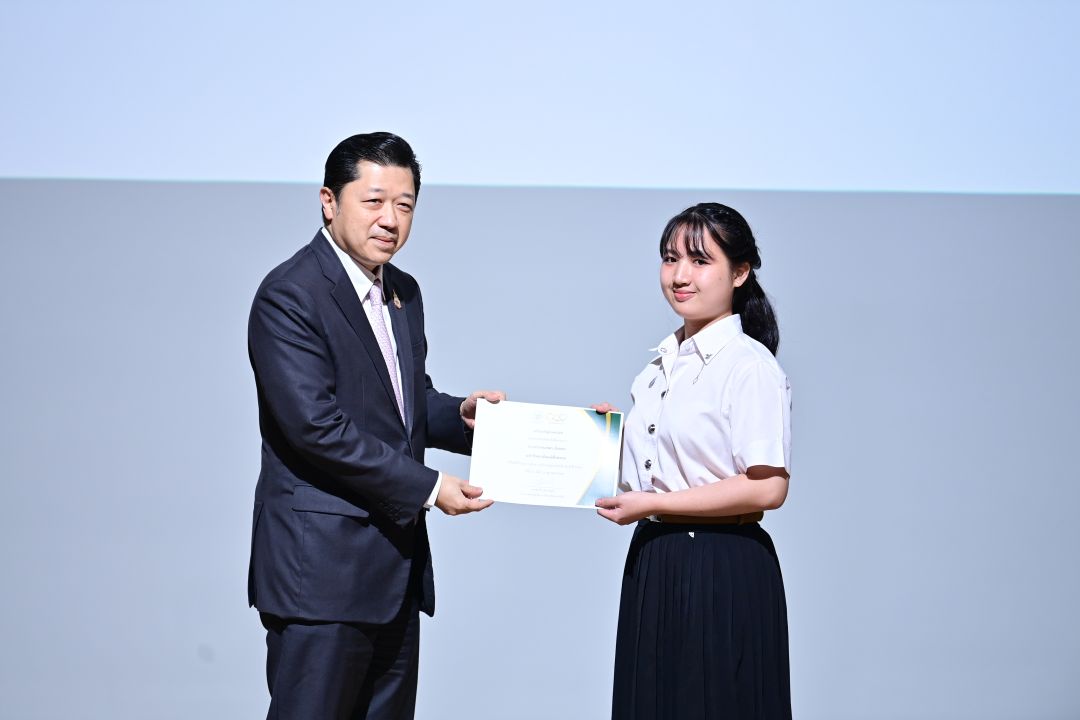 ตัวแทนผู้ได้รับทุนการศึกษามอบพวงมาลัยแทนคำขอบคุณแก่ผู้ใหญ่ใจดี