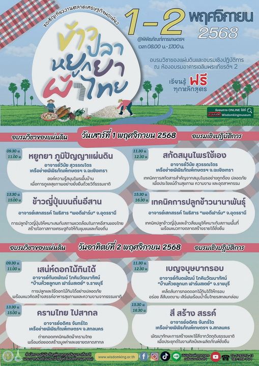 ขอเชิญประชาชนทุกท่านร่วมเรียนรู้ สืบสานภูมิปัญญาไทยตามรอยพระราชดำริ และร่วมน้อมถวายความอาลัยแด่สมเด็จพระนางเจ้าสิริกิติ์ พระบรมราชินีนาถ พระบรมราชชนนีพันปีหลวง ผู้เป็นที่รักยิ่งของปวงชนชาวไทย และร่วมทำจิตอาสา การทำริบบิ้นไว้อาลัย เพื่อมอบให้กับประชาชน และร่วมไว้อาลัยด้วยการสวมเสื้อผ้าชุดสุภาพ และทำกิจกรรมน้อมรำลึก โดยการวางดอกไม้หรือพวงมาลัยสีขาว ที่บริเวณโถงอาคารเฉลิมพระเกียรติฯ 1 นิทรรศการ “พระผู้เสด็จสู่สวรรคาลัย” ได้ในงาน ตลาดเศรษฐกิจพอเพียง “ข้าวปลา หยูกยา ผ้าไทย” ระหว่างวันที่ 1 – 2 พฤศจิกายน 2568 ตั้งแต่เวลา 08.00 – 17.00 น. ณ พิพิธภัณฑ์การเกษตรเฉลิมพระเกียรติพระบาทสมเด็จพระเจ้าอยู่หัว จังหวัดปทุมธานี สอบถามรายละเอียดเพิ่มเติมได้ที่ โทรศัพท์ 02-529-2212-13, 087-359-7171, 094-649-2333 คลิกดูรายละเอียดได้ที่ www.wisdomking.or.th หรือ Facebook / Instagram /Line ID : @wisdomkingmuseum และ Youtube : พิพิธภัณฑ์การเกษตรเฉลิมพระเกียรติฯ