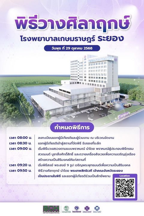 29 ตุลาคม 2568 ศ.ดร.นพ.เฉลิม หาญพาณิชย์ ประธานเจ้าหน้าที่บริหาร บริษัท บางกอกเชน ฮอสปิทอล จำกัด(มหาชน) ทำพิธีวางศิลาฤกษ์ รพ.เกษมราษฎร์ ระยอง