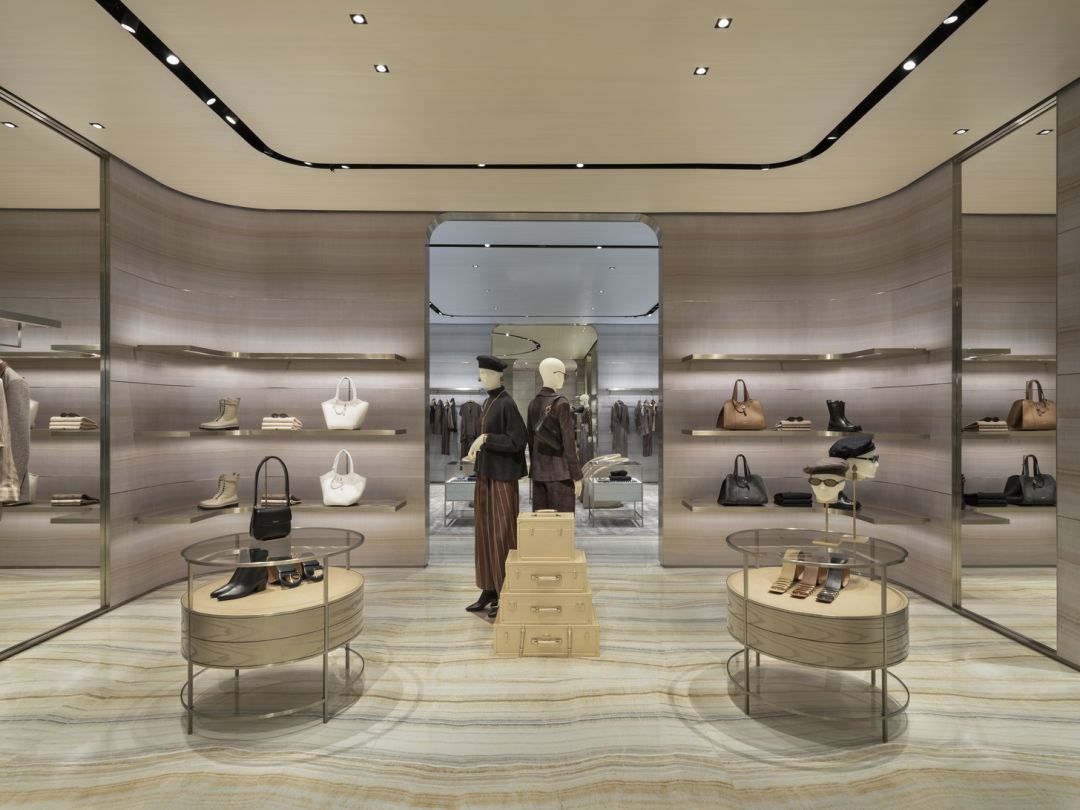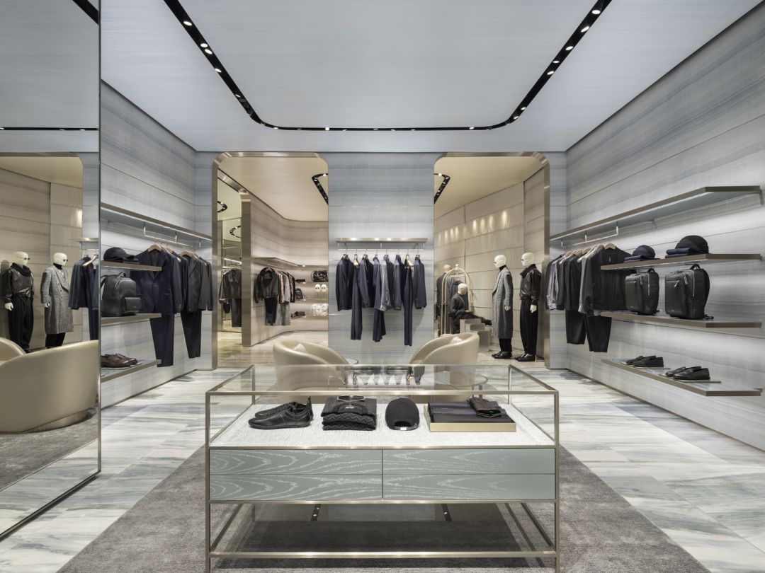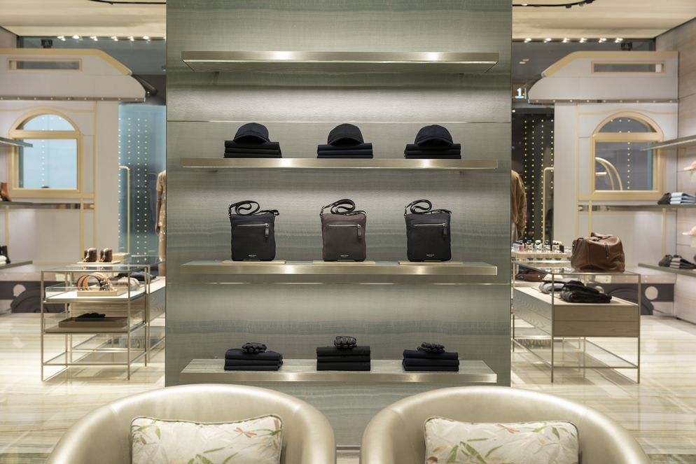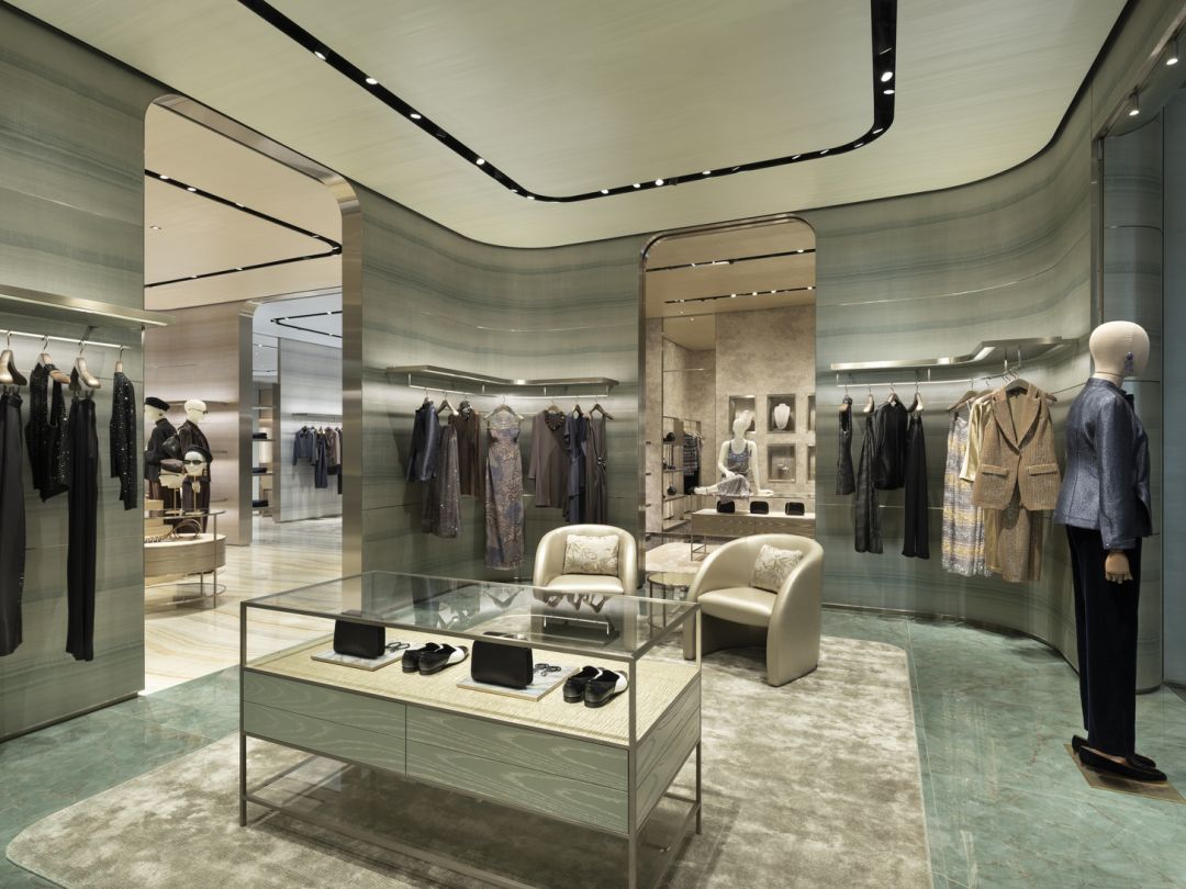 ภายในแบ่งเป็นโซนเฉพาะ แตกต่างด้วยเฉดสีเฉพาะตัว แต่ก็เชื่อมโยงกันด้วยองค์ประกอบร่วม โซนเสื้อผ้าผู้ชายมาในเฉดสีทอง เขียว เงิน น้ำเงิน และบรอนซ์ ส่วนโซนเสื้อผ้าผู้หญิงเน้นเฉดสีทอง น้ำเงิน และเขียว รูปทรงโค้งและเส้นสายอ่อนช้อยสอดแทรกอยู่ในทุกรายละเอียดงานออกแบบ ไม่ว่าจะเป็นทางเดินหรือเฟอร์นิเจอร์สั่งทำพิเศษ ลื่นไหล ดื่มด่ำ หรูหรา จากด้านนอกสู่ภายใน